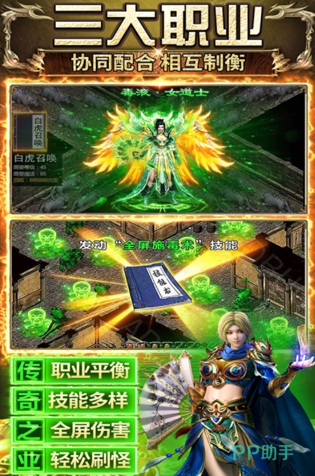 游戏中完整保留战士、道士、法师三大职业架构。各职业技能链清晰简洁,无复杂连招负担,适配移动端触控节奏。其中战士职业具备高基础生命值与稳定近战输出能力,尤其适合初次接触传奇类产品的玩家——前期练级容错率高,副本中可承担前排抗伤职责,团战定位明确且易于理解。