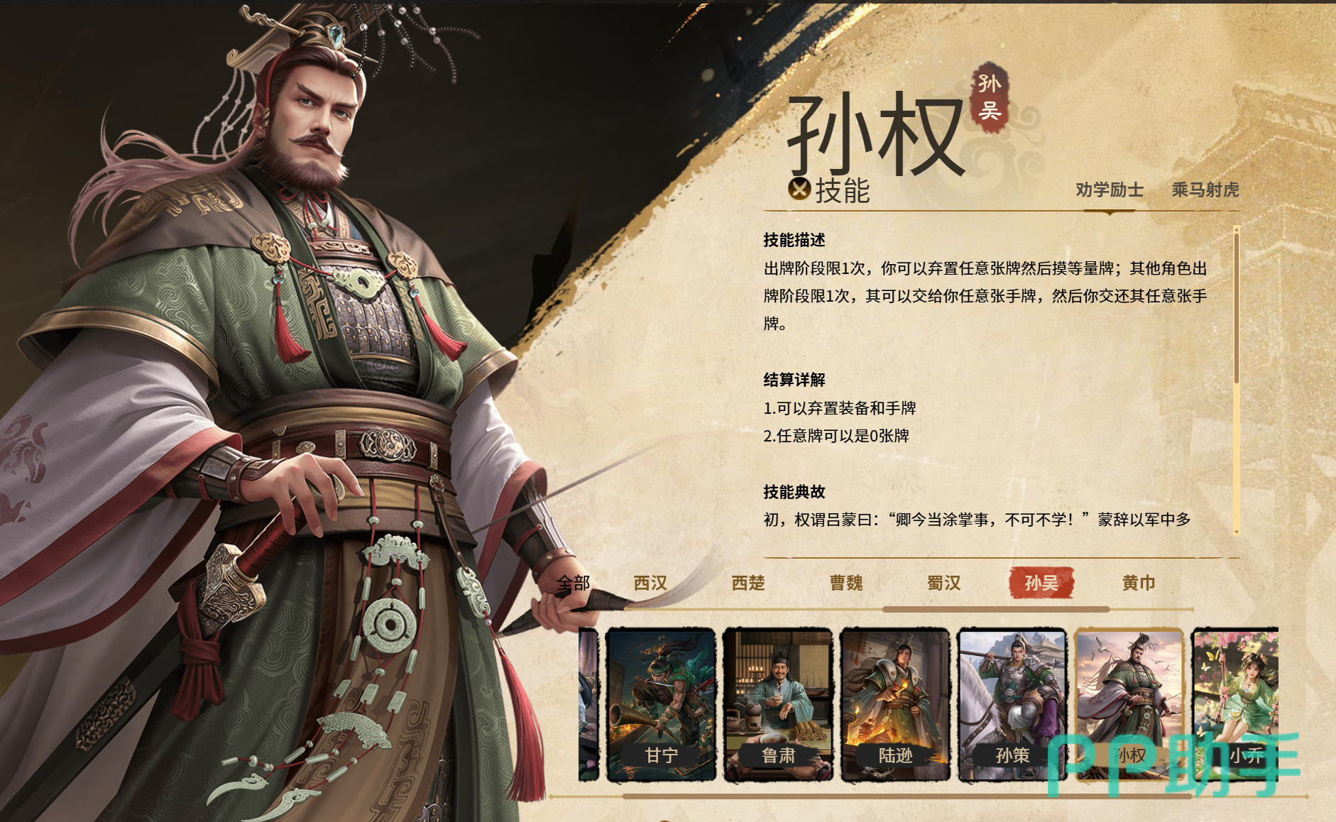孙权:出牌阶段,他可以选择弃置任意数量的牌(包括零张),然后摸取相同数量的牌。此外,其他角色在其出牌时可主动交给孙权一张手牌,之后孙权必须回赠一张牌作为交换。