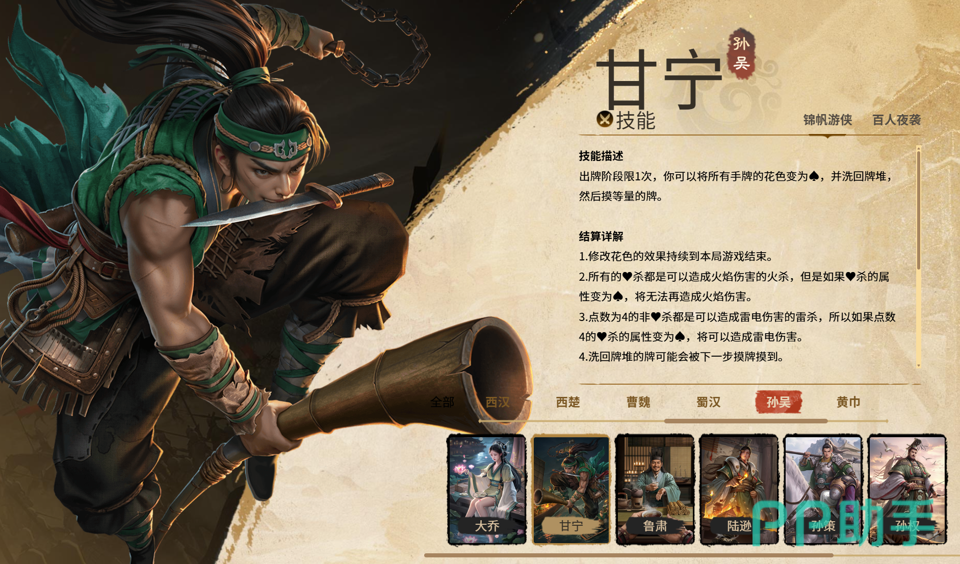 甘宁:这位武将在实战中的出场率较高,核心能力是在出牌阶段将手中所有牌的花色转变为♠,随后将这些牌洗入牌堆并重新摸取等量的新牌。该花色修改效果持续至本局结束。