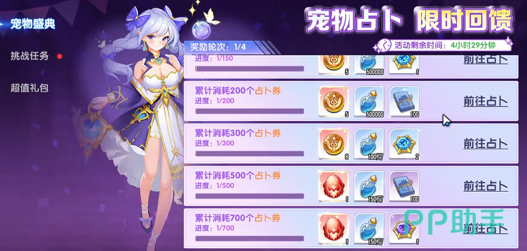 1、占卜系统抽取——该玩法即游戏内主宠物卡池,需消耗“占卜券”进行单抽或十连抽。每次占卜均按固定概率触发UR掉落机制,保底规则为90抽必得一只UR宠物,是零氪及微氪玩家长期积累的主要途径。