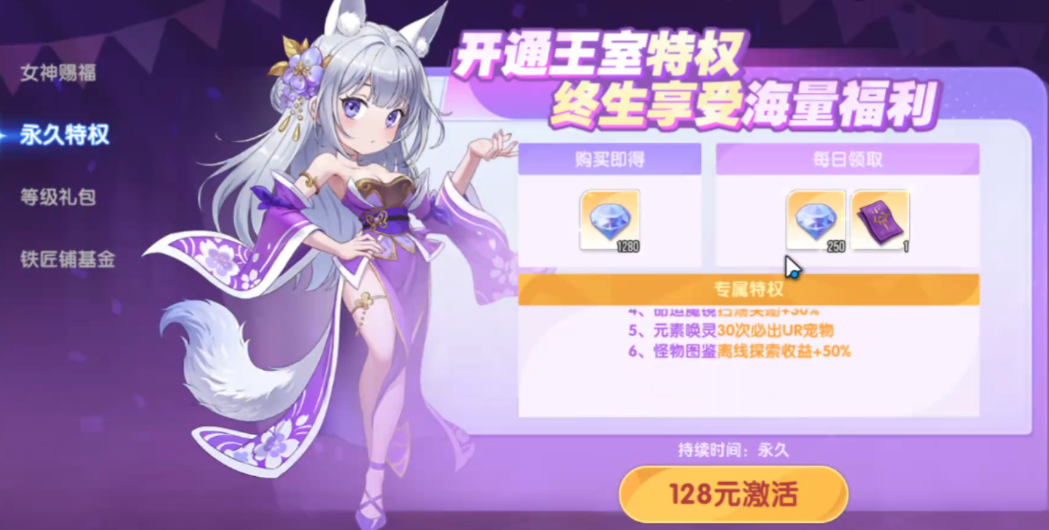 2、元素唤灵机制——该独立召唤系统开放于特定章节后,使用“元素晶核”参与唤灵。基础出率低于占卜池,但开通终身会员(支付128元)后可激活“30抽必出UR”专属保障,大幅提升获取确定性,适合追求稳定培养节奏的中重度玩家。