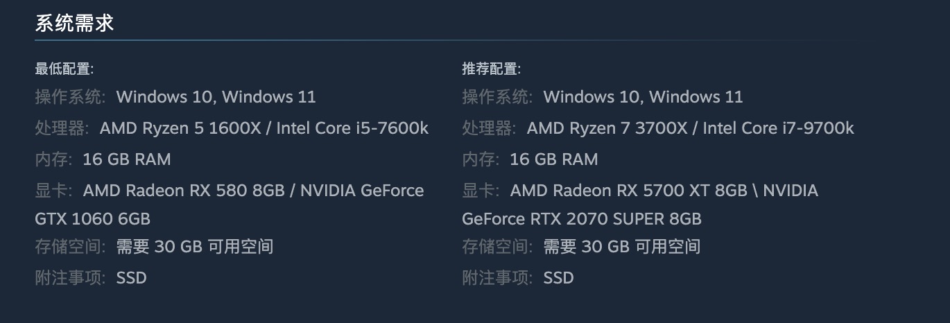 该游戏的最低配置要求包括:操作系统应为Windows 7/8/10的64位版本,处理器则需是3.2 GHz的双核处理器,无论是英特尔还是AMD品牌均可;内存方面,至少需有4 GB的RAM;显卡则需达到GTX 750或Radeon HD 7770的标准;如果玩家的设备配置较低,可以选择降低画质等设置来适应需求;而如果追求更高的画质和流畅度体验,则建议升级至推荐配置或更高的设备。