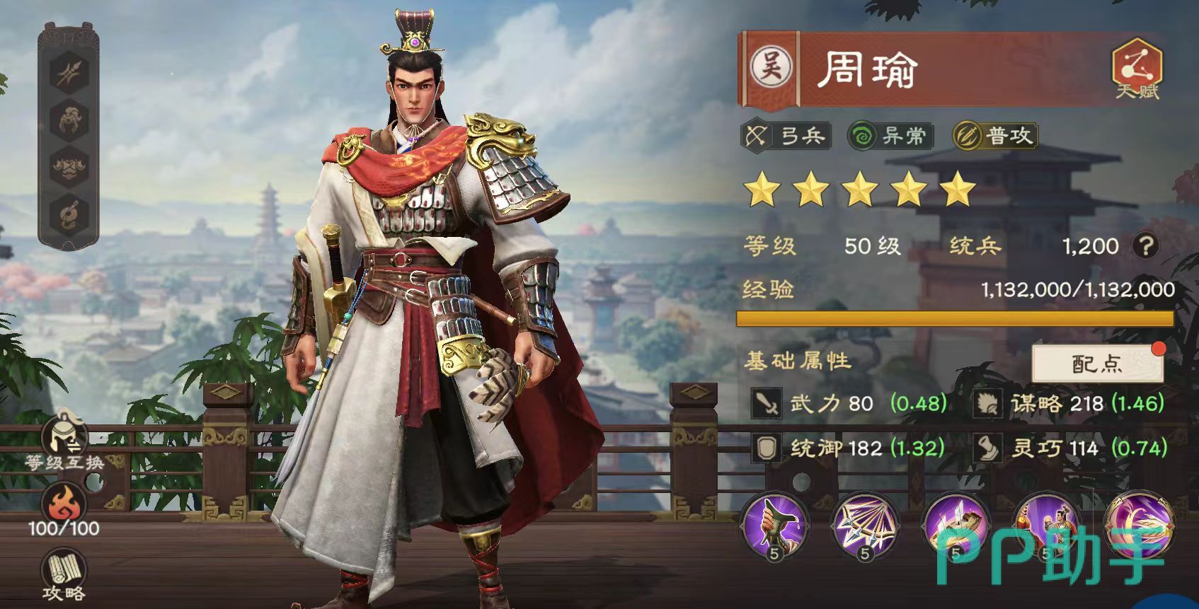从基础属性来看,周瑜拥有1.46的谋略成长值,在全游戏中属于顶尖水平,这使得他的主动技能能够打出极高的谋略伤害。同时,高谋略也直接增强了其附加的灼烧类状态伤害,进一步提升持续输出能力。此外,周瑜的统御成长达到1.32,具备一定的生存能力,有助于在长时间对战中维持兵力优势。兵种方面,他仅能统领弓兵,因此在搭配上需选择同兵种武将,限制了部分组合可能性,但也明确了发展方向。