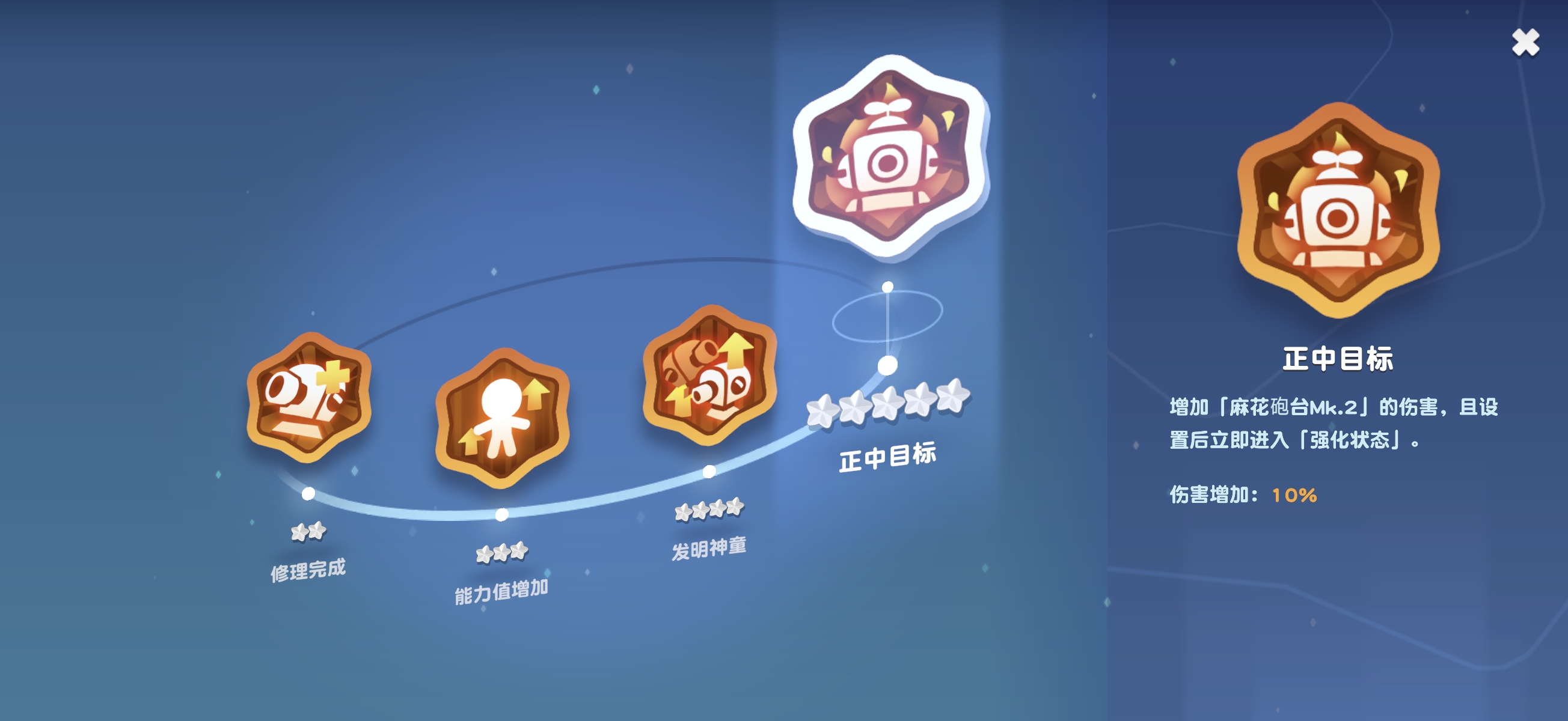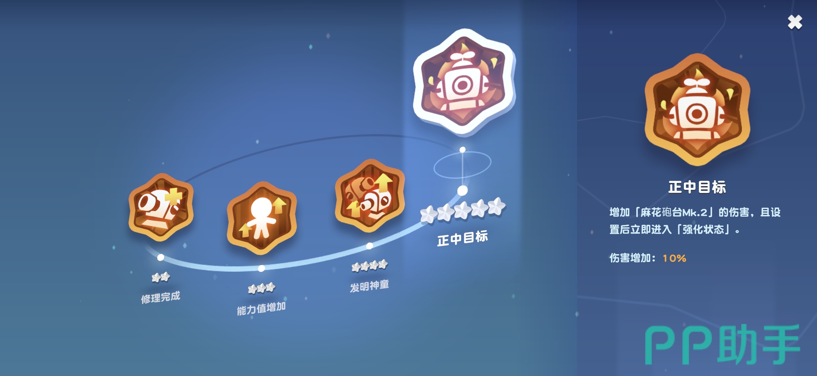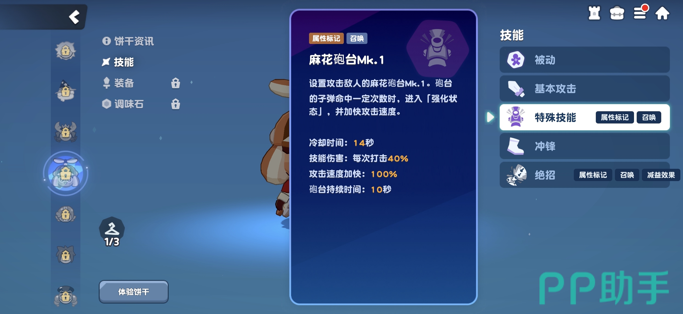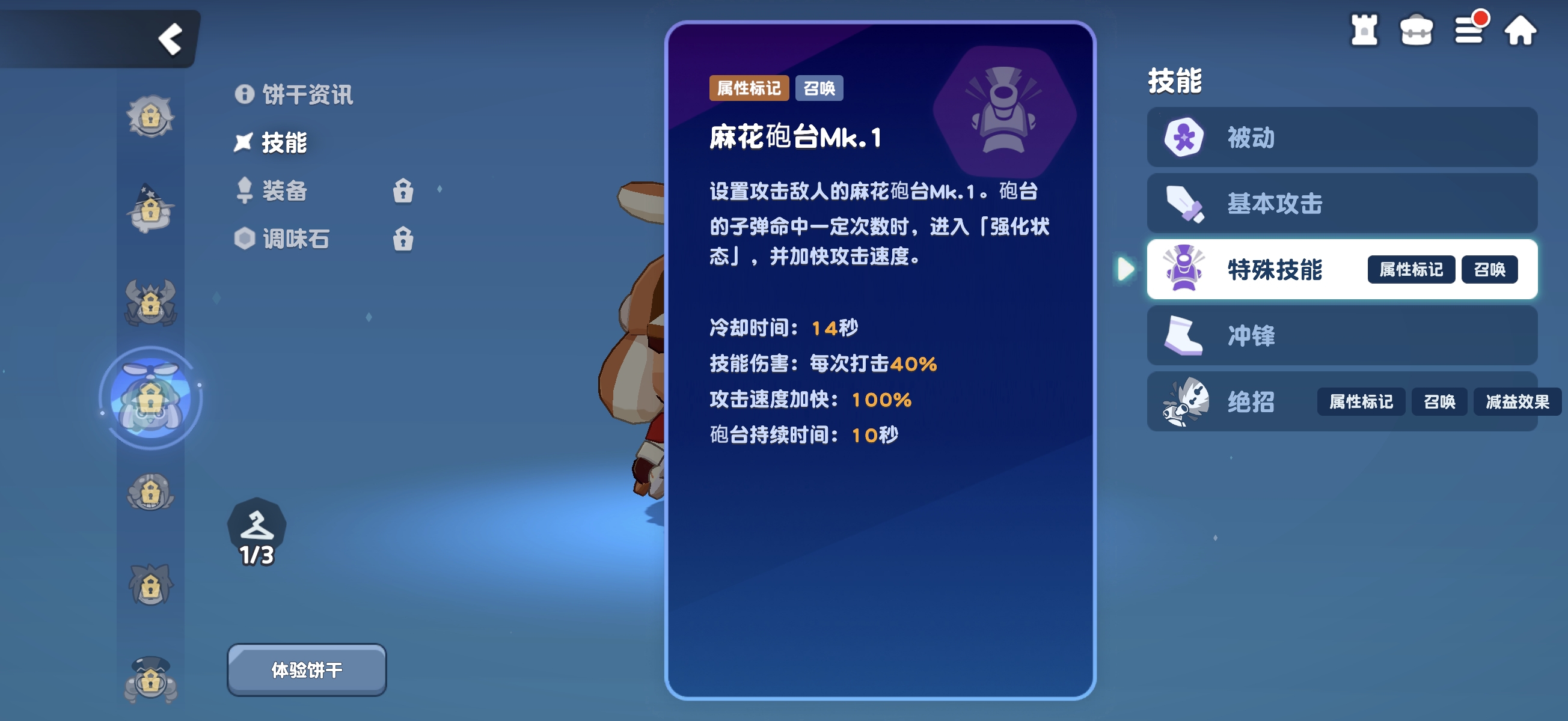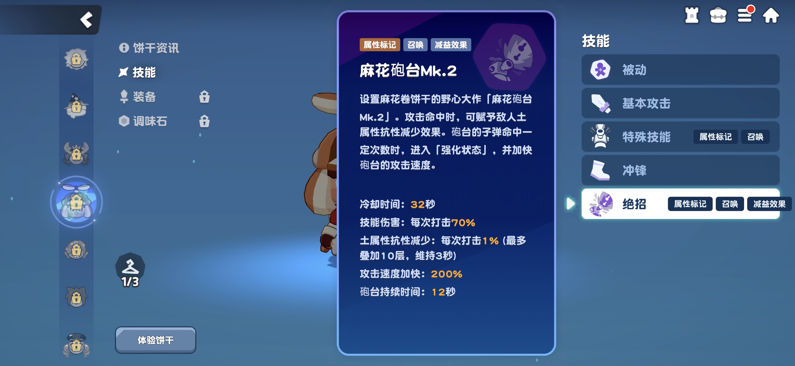需特别注意:被动减CD效果仅作用于【麻花炮台MK1】,对终极技能召唤的【麻花炮台MK2】不生效。二者属于独立技能机制,不可混淆。实战中,通过合理衔接两个炮台的释放时机,能形成持续火力压制与属性削弱双重效果。随着角色星级提升,【麻花炮台MK2】的基础伤害将获得增强,且部署后立即进入强化状态,显著提升输出稳定性与节奏可控性。