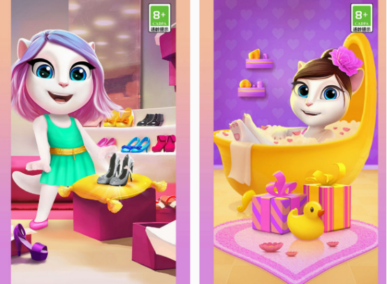 相对于单纯的化妆游戏,这款它是融入了宠物养成这种玩法的,以大家熟悉的可爱安吉拉,这一个白色的小猫咪为主角,无论你是想要让它在卫生间里面泡澡,享受惬意的美好时光,或者是穿漂亮的衣服鞋子以及打造妆容,都是可通过点击屏幕的方式做到。属于玩法非常简单,也是适合很多年龄段玩家的,并没有复杂的操作方式。