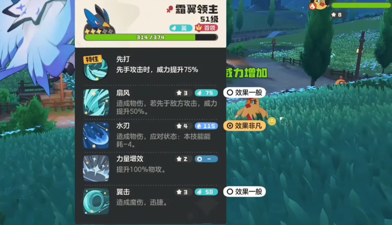 如果想在战斗中上阵霜翼领主,各位先要培养一只岚鸟,并让它获得首领血脉,这样岚鸟就能在战斗中通过首领化成为霜翼领主,自身也将具有顺风特性,能在先手时让技能的威力提升75%。配合上它本身的高速度,基本上都能做到优先出手,所以在技能的搭配上最好以攻击为主。