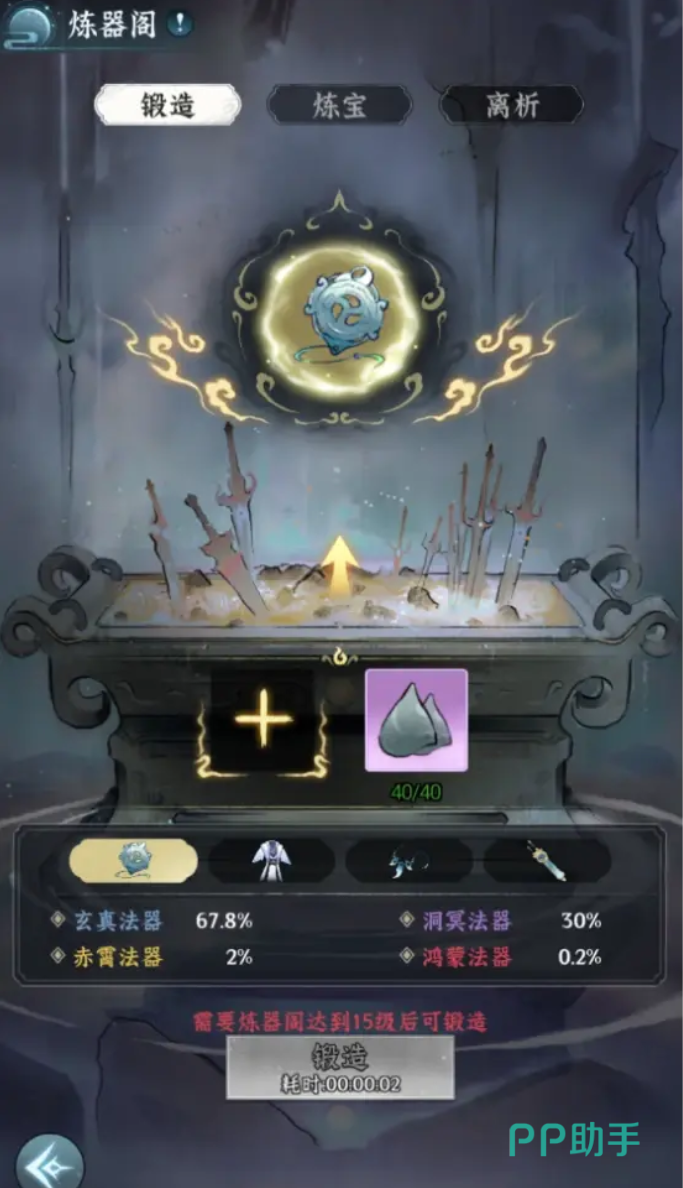 炼器阁需角色达到15级方可解锁锻造功能。该阶段起,玩家可消耗鬼将领颅骨等指定材料启动锻造流程,单次锻造耗时固定为2秒,完成后随机产出不同品阶的法器。需特别注意:锻造成功率与材料品质无直接关联,但高品质材料可显著提升高阶法器的产出概率,因此建议优先积累稳定材料来源。