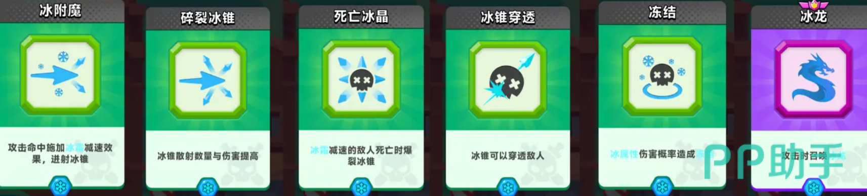 第四步选择冰锥穿透,使冰锥具备额外穿透能力;第五步选择冻结,赋予冰属性攻击一定概率冻结敌人的能力;最终选择冰龙,可在攻击时召唤强力冰龙协助作战,显著提升整体输出水平。