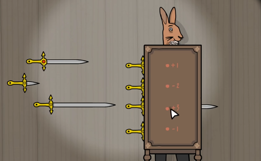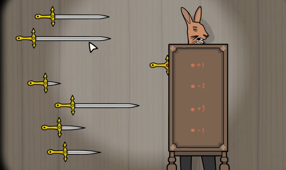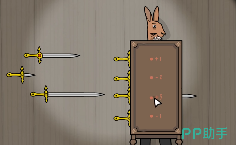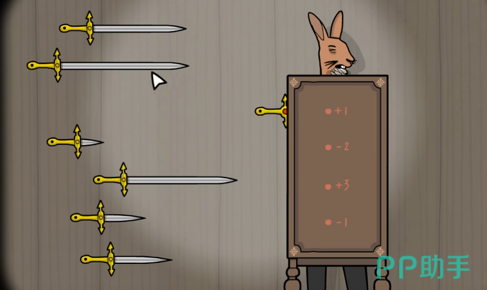插件这一关卡会出现在游戏内的第10幕,在屏幕上,玩家们可以看到场上一共出现了7把剑,而在兔子先生的身上有一个木箱,上面写着不同的数字。此时小伙伴们要做的就是从这7把剑中选择出合适的4把,并且插入到准确的位置,这样才能够保证兔子先生的身体不受到伤害,但同时又能够顺利地完成本次的魔术。