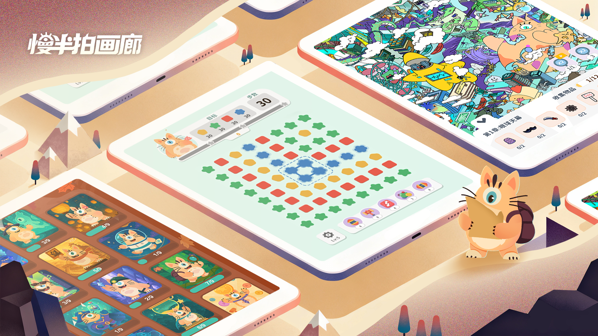 《慢半拍画廊》是一款以手绘风动画为视觉核心的休闲消除类游戏,整体画面采用鲜明饱和的卡通配色,营造出温暖治愈又富有童趣的沉浸式世界。玩家将在色彩斑斓的画廊场景中展开探索,通过连线消除、隐匿寻宝、互动解谜等多种机制,逐步解锁丰富内容与独特奖励。