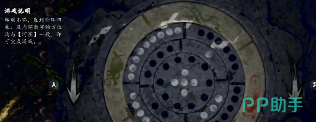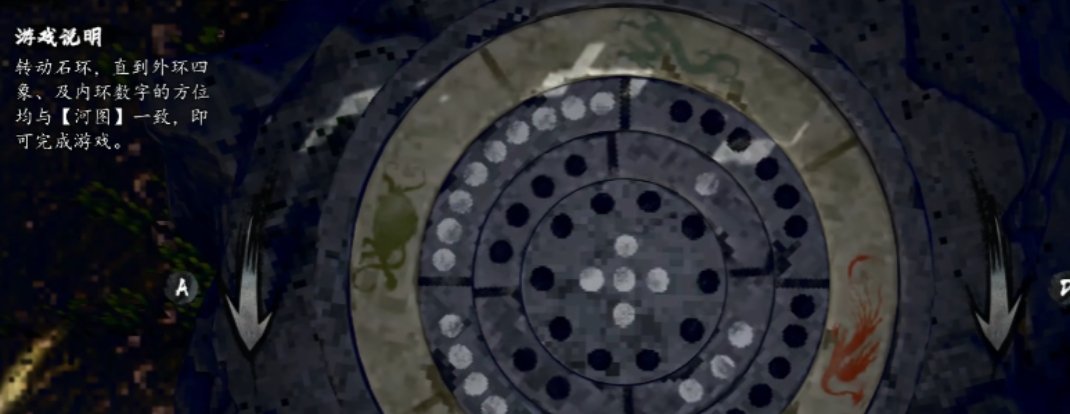 首关为三环联动石阵:外环、中环与内环构成嵌套式传动结构。目标是使内外两环数字排列完全契合河图洛书布局——四象方位恒定:上朱雀、下玄武、左青龙、右白虎;对应数字关系亦不可变更:黑6与白1位于下方,白7与黑2居于上方,黑8与白3布于左侧,白9与黑4列于右侧。核心机制在于三环间的齿轮比:外环旋转一周,内环同步转动三周;中环每转1.5圈,可驱动外环完成一整圈;而内环每转动一圈,则推动中环偏移0.5圈。这一组固定比例构成了整个机关的底层逻辑。