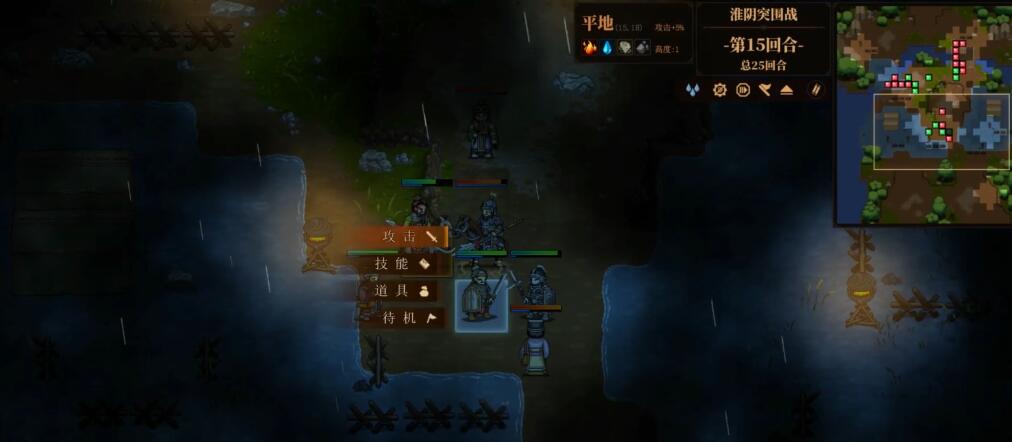 开局优先派遣张飞(重骑兵)抢占西侧隘口,利用咆哮技能降低敌军30%攻击力,并触发地形石砌护栏的格挡率加成(+15%)。同时刘备需在第二回合前触发与老农的隐藏对话,选择赠予米酒会有一个乡勇助阵增益(全队防御+10%,持续3回合)。赵云(轻骑兵)要去到东侧清除弓兵据点,防止其干扰后排治疗单位。