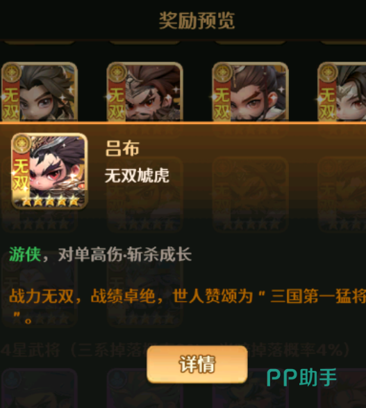 被动技能【无双飞将】赋予吕布持续作战能力:每当敌方有单位阵亡,吕布恢复自身8%最大生命值;触发该效果后,若存在生命值低于10%的敌方目标,将立即追加一次额外攻击。此外,每次普通攻击均可为吕布叠加1层增益,每层提升15点物理攻击与15点防御,最高可叠加10层,显著增强其攻防成长曲线。获取途径为求贤阁召唤,属稀有可抽取角色。