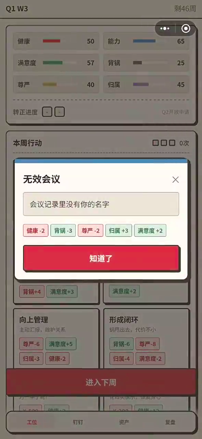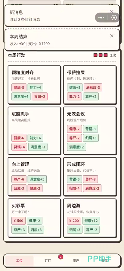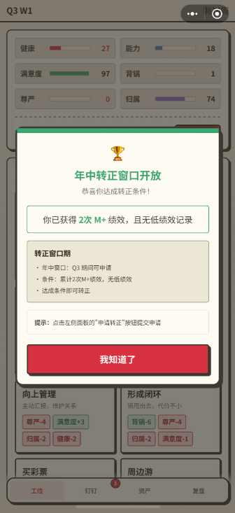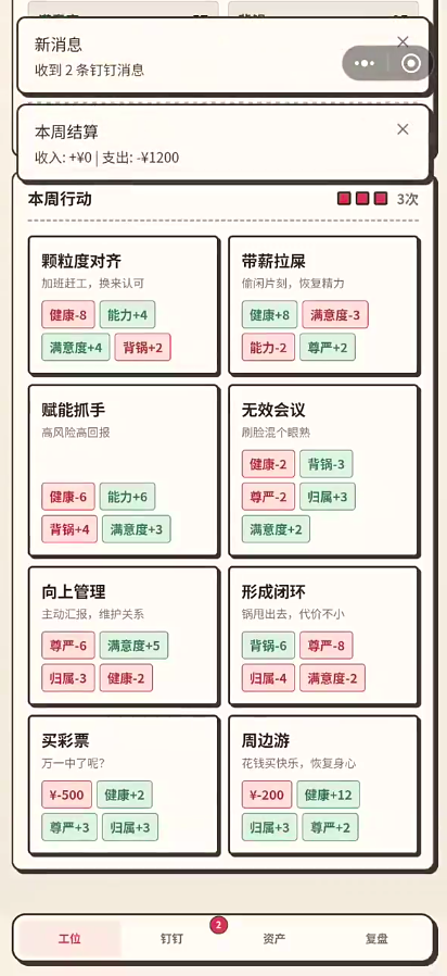 游戏深度融入当下互联网从业者的典型语境与行为模式,如“带薪拉屎”“无效会议循环”“需求反复变更”“周五下班前改需求”等场景均以机制化方式呈现。同时支持自由时间分配,玩家可在工位摸鱼、前往公司楼下彩票店刮奖、或在附近证券营业部尝试短线操作,用随机性平衡高强度工作节奏。