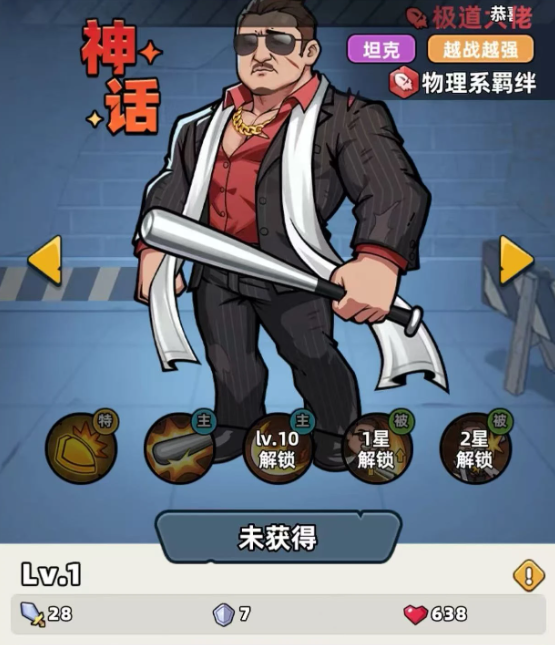 极道大佬是队伍前排的重要支撑角色。凭借基础属性成长优势,可自然获得高额生命值与防御力;技能提供显著免伤效果,能有效格挡敌方关键攻击;大招挥舞球棒发动大范围物理打击,附带击退控制,兼顾坦度、反伤与群体打断能力。