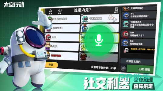 这是一款源自中国的太空主题策略手游,它以新颖的游戏机制与开放的社交互动赢得了众多玩家的青睐。游戏背景设定在浩瀚无垠的宇宙飞船及空间站之中。参与者会被随机分配到不同的团队,共同目标是修复太空航行器上的各项设施。在同一队伍中的探险者需携手解开一系列谜题与挑战。而暗藏玄机的背叛者则需悄悄策划捣乱行动,以达成自己的胜利条件。