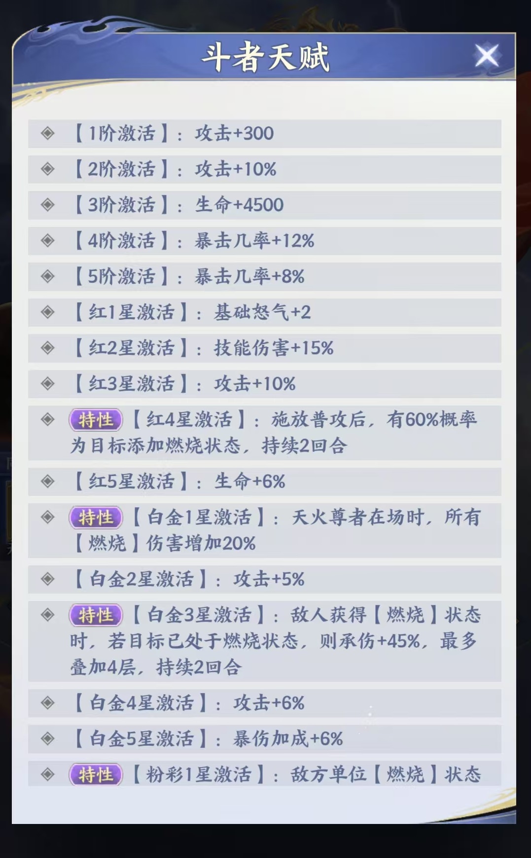 其核心技能“空间绞杀”为全体攻击技,除基础伤害外,附带概率施加【燃烧】状态,持续两回合。该状态每回合依据施法者30%攻击力进行真实伤害结算,全程无视目标防御属性。这一机制使其成为当前版本中灼烧体系最稳定、最高效的触发源。随着星级提升,天火尊者的灼烧能力持续强化:红四星时,普攻亦有概率附加燃烧;白金一星起,全队燃烧伤害提升20%;白金三星阶段,若目标已处于燃烧状态,则额外叠加一次伤害;粉彩一星后,当敌方单位燃烧效果被清除或驱散时,将自动蔓延至相邻单位,大幅提升连锁覆盖率。