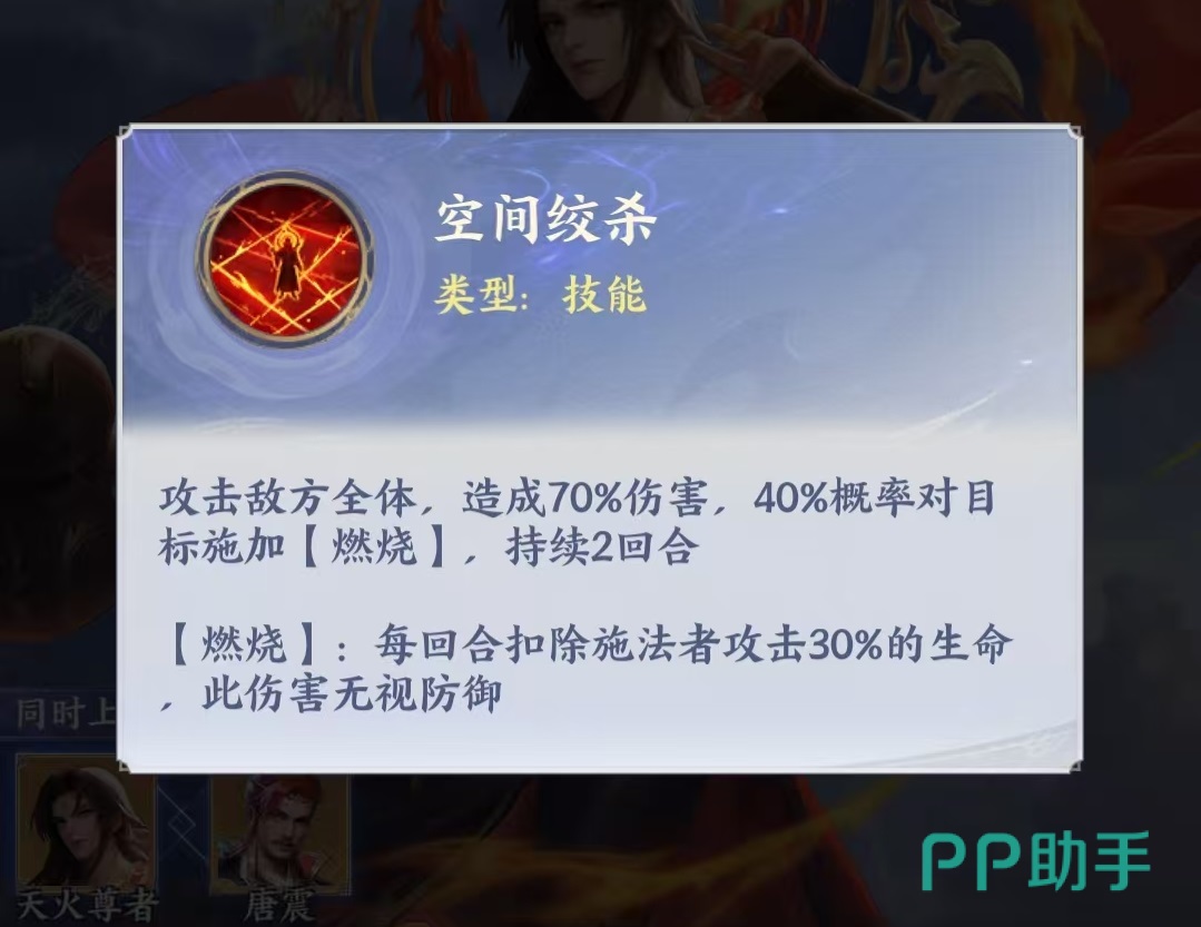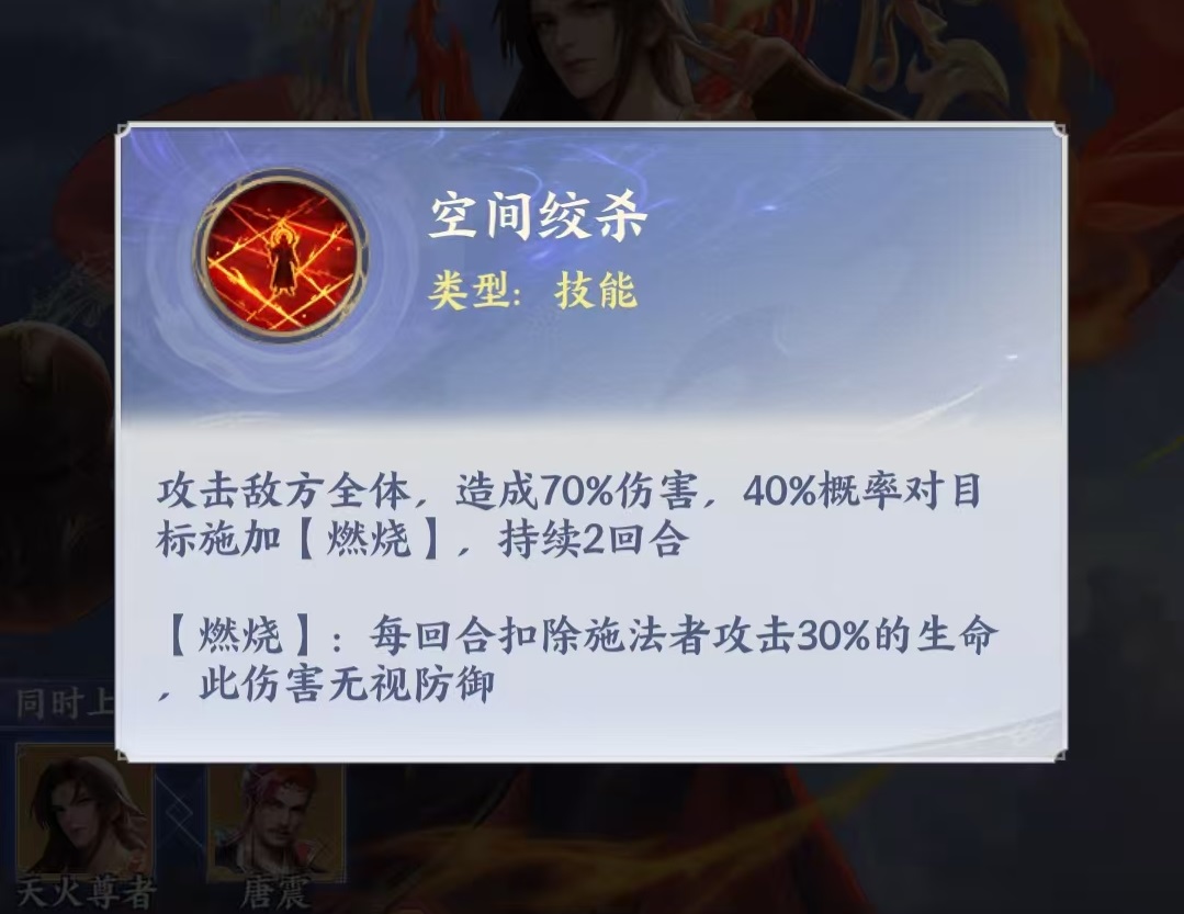 当角色晋升至白金一星后,天火尊者正式确立为燃烧阵容的核心驱动者。围绕其构建的推荐组合为:天火尊者、唐震、邙天尺、风尊者、玄空子。其中,唐震全体攻击附带对燃烧目标的眩晕控制,并可概率补足未燃烧单位;邙天尺技能命中燃烧目标越多,额外释放概率越高;风尊者则能主动将单个单位的燃烧效果扩散至周围敌人,形成多层叠加与持续压制闭环。