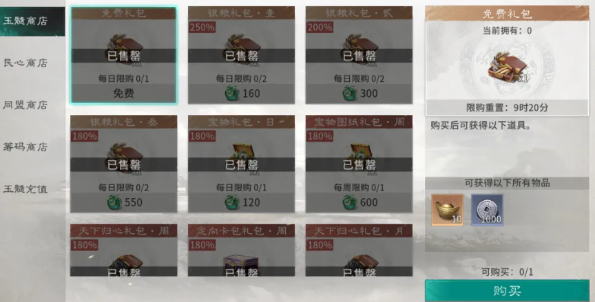 贡献商店是前期资源转化核心渠道,战功可兑换铜币、粮草、武将经验丹等刚需物资;贡献值越高,可解锁的稀有道具档位越丰富。玉髓商店仅限充值用户高频使用,平民玩家建议仅在关键节点(如突破武将星级)时酌情兑换。筹码商店采用骰子机制,其中征兵符为必购项——该道具可直接提升部队上限,对快速扩充战力具有立竿见影的效果。