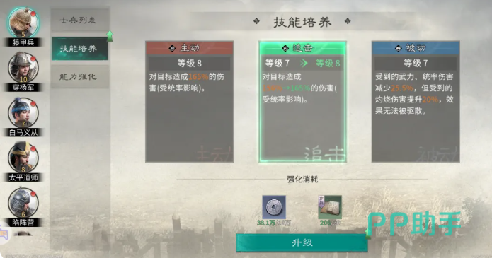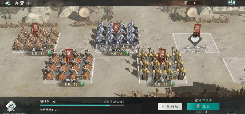 士兵分解切勿按评级一刀切,须依据特技实用性筛选。资源有限时,推荐集中培养单一主力兵种:步兵首选藤甲兵(高防御+反伤),弓兵主推连弩兵(群体压制+减防),骑兵培养至铁骑即可满足中期作战需求,术士流派推荐五道米(范围控制+状态施加)。各兵种上阵后触发的协同效果存在显著差异,需结合自身阵容定位动态调整。