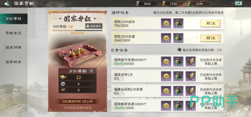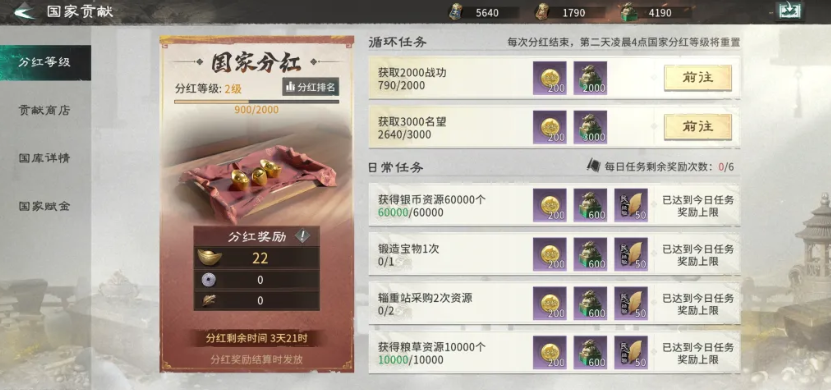 国家贡献系统中,玩家可实时查看当前分红等级。日常任务务必全勤完成,其中民心类任务具有高性价比,不可跳过。战功主要来源于攻城战与野外PVP,而名望则需通过副本挑战获取,名望等级影响官职晋升与特殊增益效果。民心资源支持兑换木材与铁矿——前者用于城市建筑升级,后者为兵营、器械台等核心设施建造所必需。