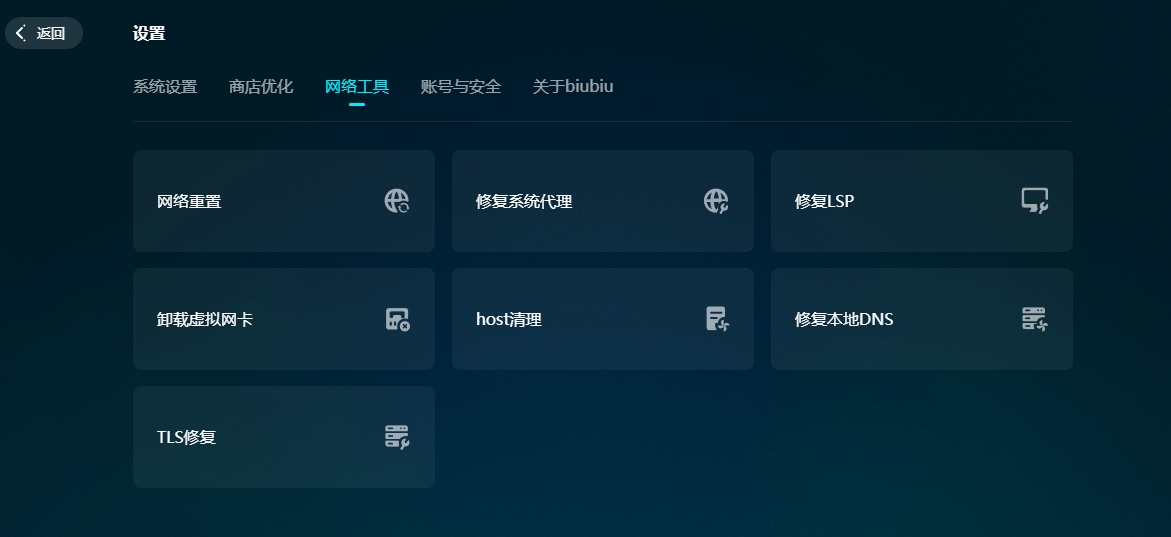 除了范围广,biubiu还全面,有时候玩家会遇到各种网络故障,biubiu的工具箱里面是各种修复功能,选择对应的进行使用,烦恼就消失了。
