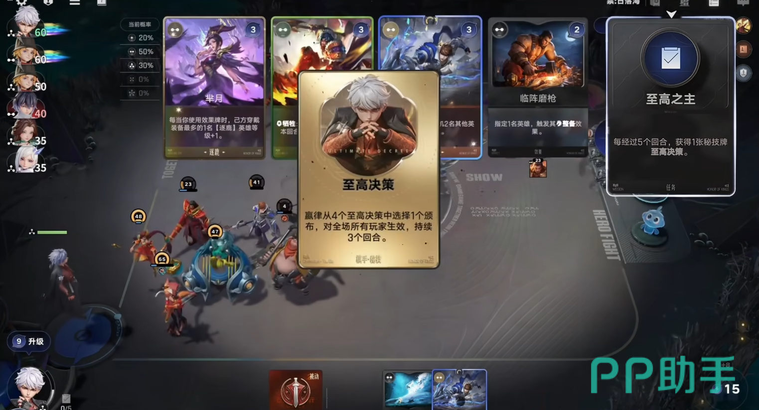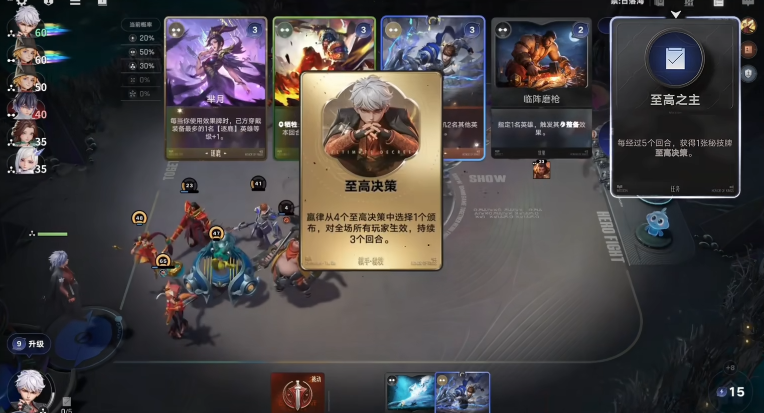 秘技“至高之主”按固定回合间隔生成,使用后从多套全局规则中选择一项,强制影响全体玩家3轮,例如限制对手刷新次数、提升我方经验获取上限或增加英雄基础攻击力。其6级天赋“特权决策”提供三项差异化强化选项:一是硬控敌方最高等级单位并提升己方输出;二是允许透支能量换取短期爆发式升级;三是棋手淘汰后保留额外生命值延续战斗。三项选择均具备明确战术指向性,便于新手建立清晰的阶段性目标。