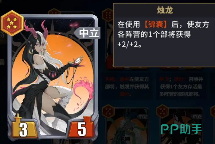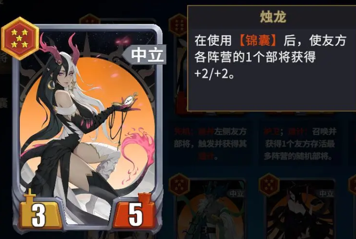麒麟所赋予的永久屏障与连接效果,使其具备极强的站场稳定性,从而为挂件卡的多样化配置提供坚实基础。该体系不依赖单一统帅角色,角色轮换空间大,但必须确保烛龙、麒麟两大核心机制正常运转——其余卡牌只需围绕增益、续航、控场等方向进行功能性补充,整套阵容即可维持高强度输出与生存能力。