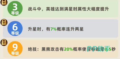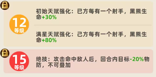 等级成长路径明确指向功能性深化:升至9级时,黑熊攻击附带20%概率眩晕,持续0.5秒。该控制效果虽短,却能精准衔接高攻速射手的集火窗口;抵达12级后,基础天赋强化为每名射手提供黑熊30%生命加成;满星状态下,该加成跃升至80%,使黑熊成为兼具坦度与输出的复合型单位。