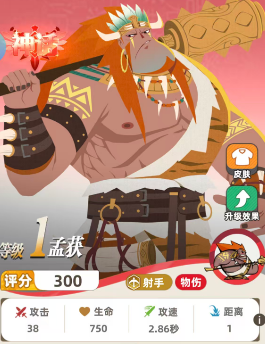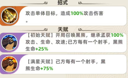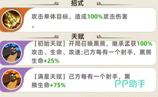 作为神话品质射手,孟获的基础攻速达2.86次/秒,显著优于攻速普遍在3秒以上的同类单位。其物理伤害为全额单体输出,在后期具备稳定高额爆发能力。开局即触发的天赋效果可召唤黑熊——该召唤物完整继承孟获100%的攻击力、生命值与攻速属性,相当于场上额外部署一名功能完整的射手。更关键的是,每存在1名我方射手,黑熊生命值提升25%;若阵容达成五射手配置,黑熊生存能力将获得质变级强化。