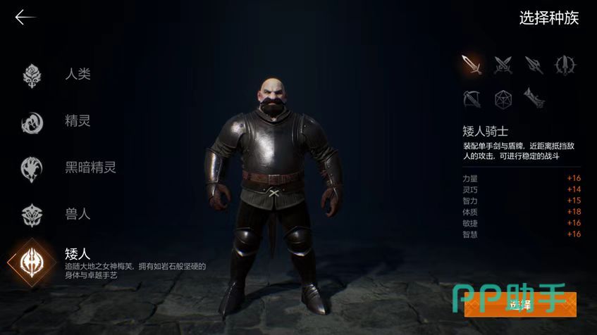 游戏中目前开放了五大基础种族:人类、精灵、黑暗精灵、矮人和兽人。若想成为矮人骑士,必须先选择“矮人”作为初始种族,随后在职业进阶路径中选择成为矮人骑士即可完成转职。该职业以单手剑与盾牌为主要武器配置,专注于近身格挡与防御反击,在前线作战中表现出极强的稳定性。