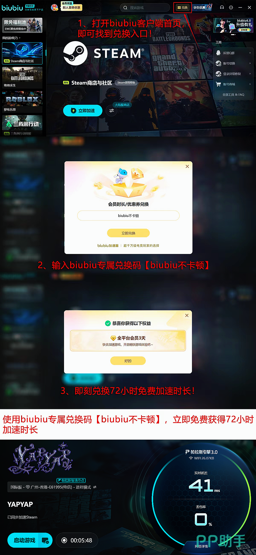 新用户完成注册后即可激活24小时全游戏免费加速权限;此外,输入专属兑换码【biubiu不卡顿】,新老用户均可额外获赠3天加速时长。两项福利叠加后,新用户最高可享96小时连续加速服务。