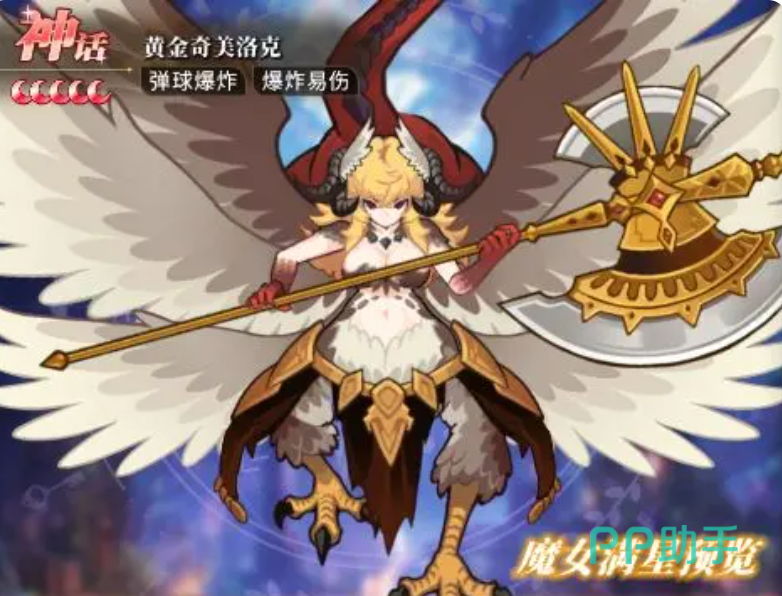 从视觉设定来看,黄金奇美洛克融合了半神化生物特征:背生羽翼,下肢呈锐利鹰爪形态,上身保留人类轮廓,手持巨型法器,整体造型兼具神圣感与压迫力。作为神话品质角色,其核心输出方式为弹球爆炸伤害,并附带“易伤”减益效果——即命中目标后,使其在后续受到的爆炸类伤害显著提升,从而强化全队协同输出效率。