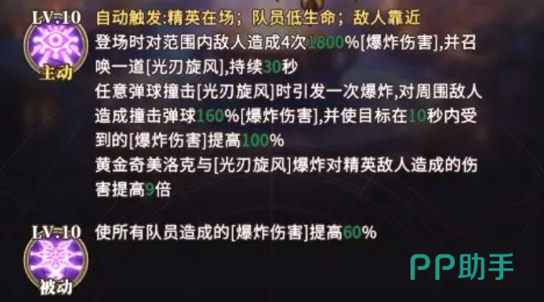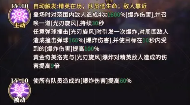 该角色的主动技能具备智能触发逻辑:仅当战场中存在精英单位、我方角色生命值低于安全阈值,或敌方单位逼近关键区域时,技能将自动激活。一旦登场,黄金奇美洛克立即对范围内敌人造成总计1800%攻击力的爆炸伤害,且该爆炸分四段连续释放;同时召唤持续30秒的光刃旋风。所有弹球撞击旋风时,均会引发一次额外爆炸,造成相当于弹球基础伤害160%的范围爆炸,并使受击目标在10秒内承受的爆炸伤害提高100%;针对精英单位,该增伤效果进一步强化至9倍增幅。