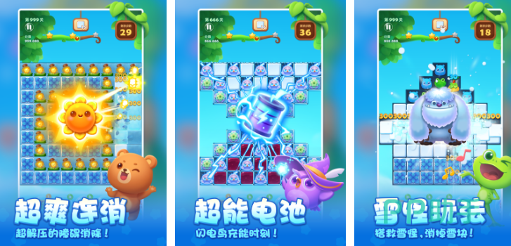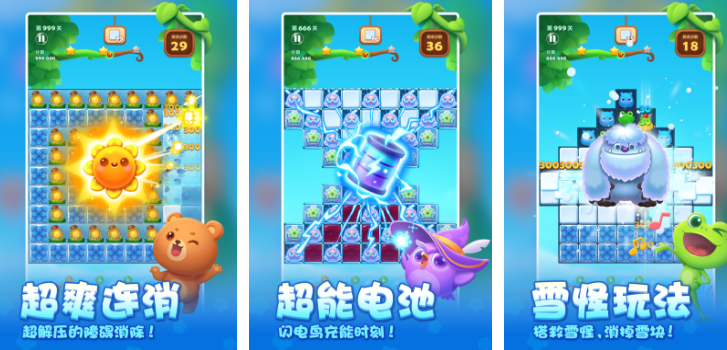 这款手游的玩法简单,并且总能出其不意的给玩家们超爽的体验。大家只需要动动手指,点击连接相同的方块就可以消除得分。并且游戏里还有着非常有设计感的道具,比如超能电池能够大片的消除方块,用起来还是非常解压的。游戏里还有解救雪怪的玩法,大家要开动脑筋消除困住雪怪的冰块才行。
