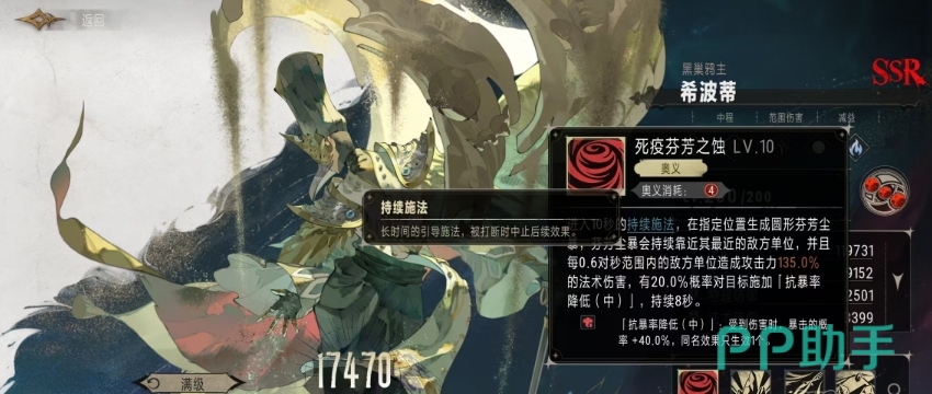 希波蒂的奥义技能叫做死疫芬芳之蚀,当使用这一技能后,会进入到10秒的持续施法时间,在指定位置形成一片圆形的芬芳尘暴,这片尘暴并非静止不动,而是会持续靠近距离最近的敌方单位,在尘暴靠近敌人的过程中,每0.6秒钟就可以对范围内的敌方单位造成135%的法术伤害,这意味着在短短几秒钟内,敌人就会受到多次高额伤害。