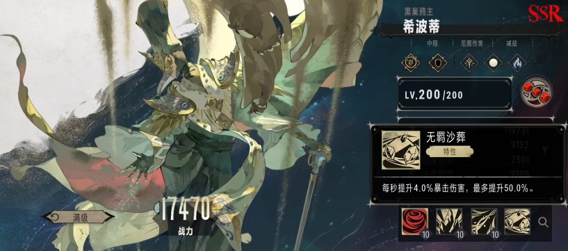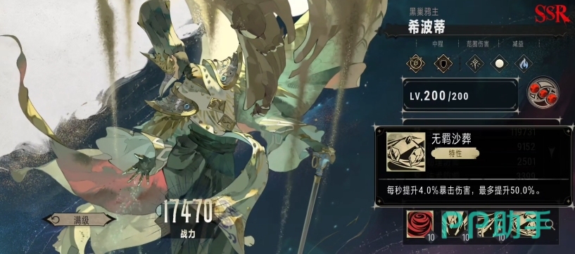 再看看它的特性,可以说是非常实用,希波蒂每秒能够提升4%的暴击伤害,这个提升效果会持续累积,最多可以提升到50%,也就是说随着战斗时间的推移,在战斗开始之后的13秒左右,它就能将自身的暴击伤害提升到最高值,这一特性使得希波蒂在战斗中越往后输出能力越强,尤其是在持久战中是特性效果更强一些的。