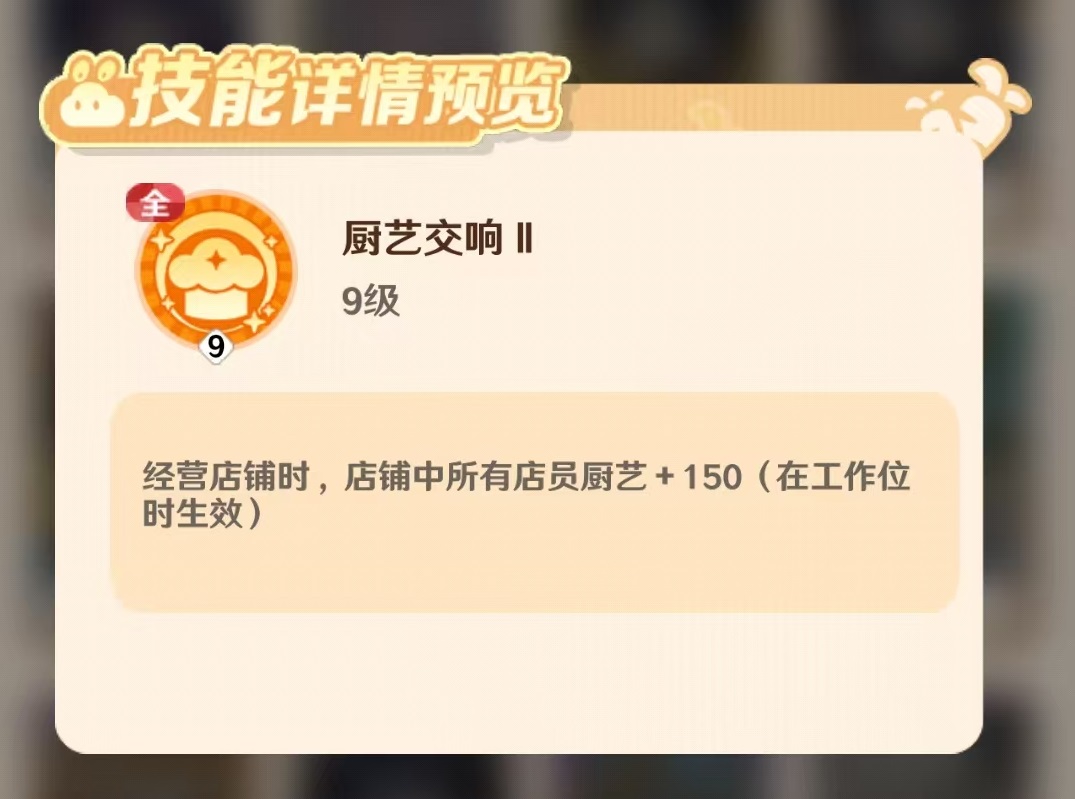 第二个单体技能则依赖于高入座率触发,激活后可提升皮皮自身的移动速度与工作效率,但拥有较长的冷却周期,适合在客流高峰期部署使用。而两个全体技能分别以百分比和固定数值形式,提升所有店员的厨艺水平,双重加成机制使其在团队辅助方面表现出色。