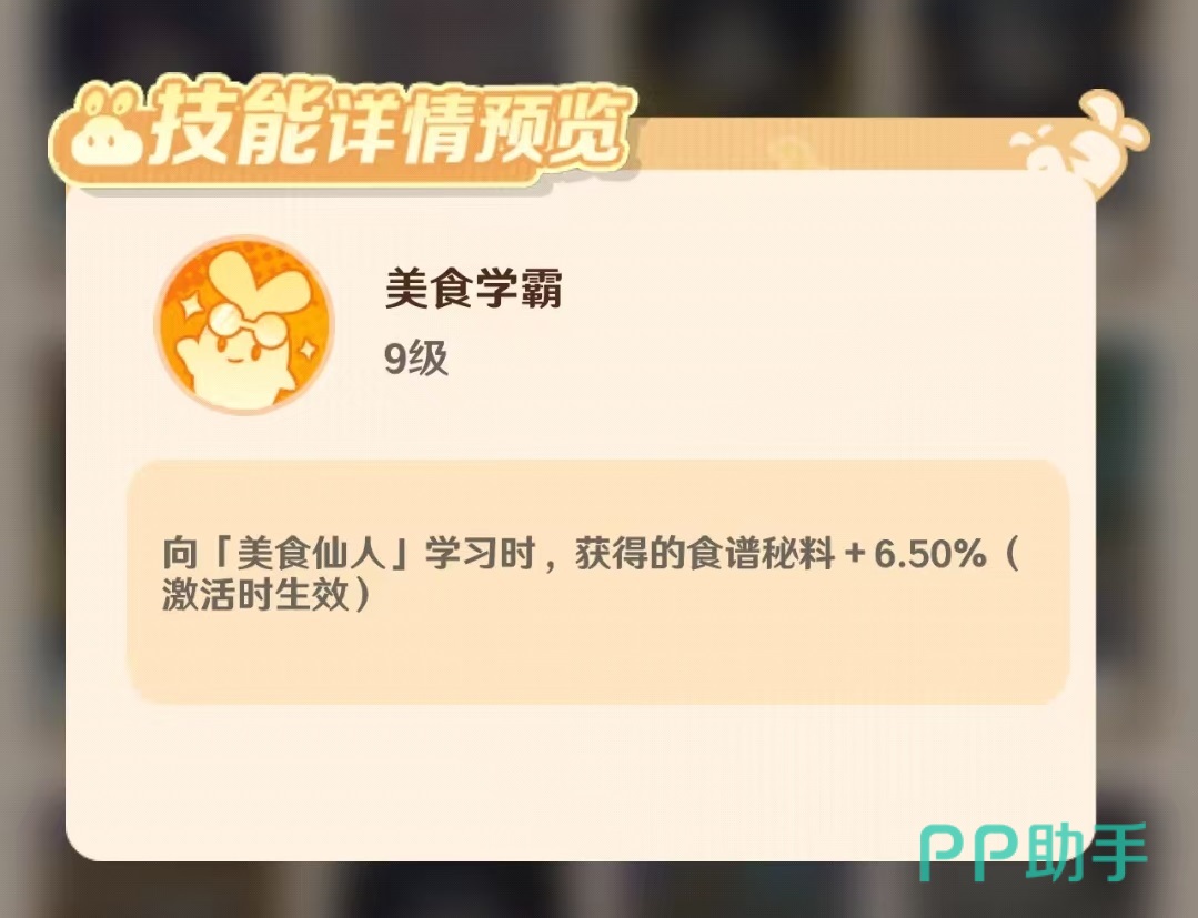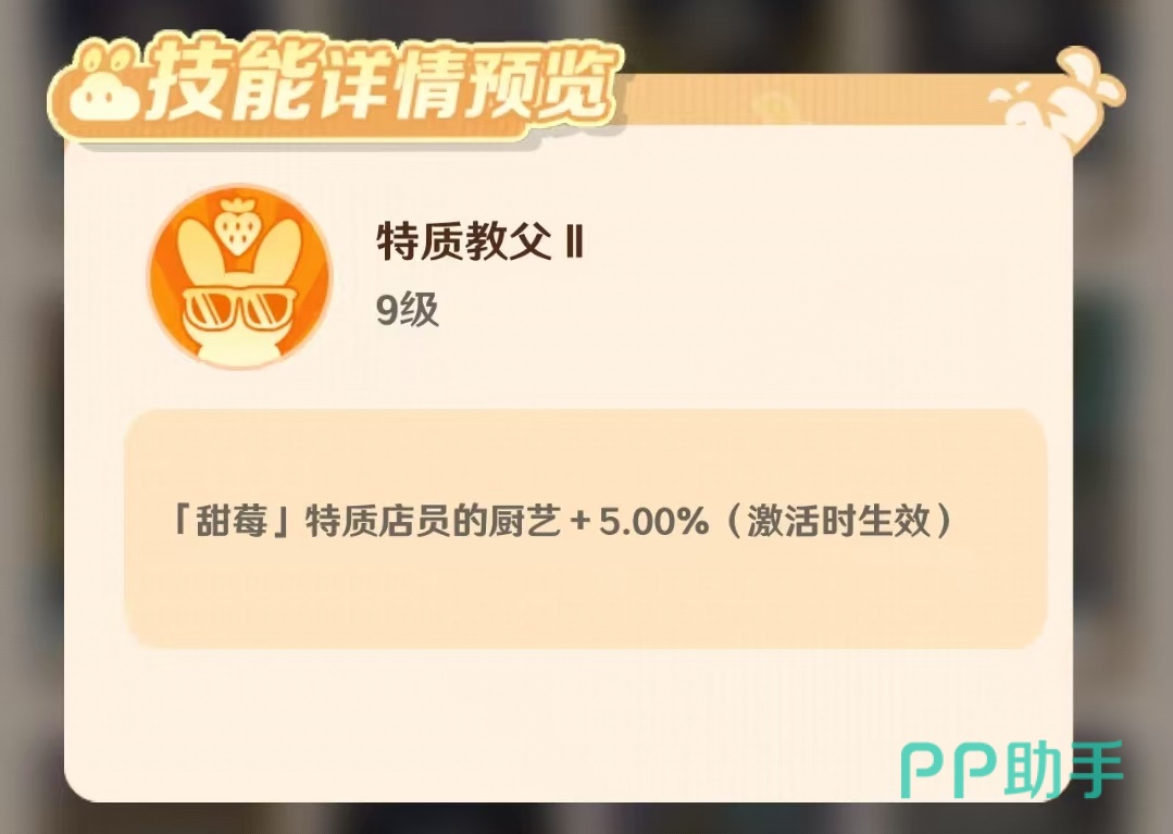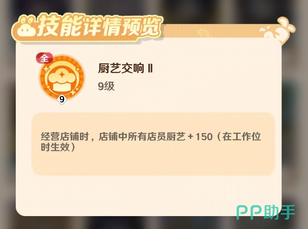 技能方面,皮皮配备了两个单体技能和两个群体增益技能。其首个单体技能为:在店铺聚餐事件发生期间,自身厨艺属性提升13%。该效果仅在工作会场景中激活,需将皮皮安排至指定工作位方可生效,合理调度能显著增强特定环节的表现力。