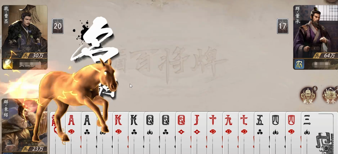 袁绍的核心驱动机制名为“威望”,属于典型的渐进式资源积累体系。每打出一张手牌,即可获得1点威望;若该次出牌未被其他玩家压制(即无人使用更高阶牌型压制),额外再获得1点。看似规则简明,实则暗藏节奏博弈——何时出单牌试探?何时保留关键牌延后触发?是否主动放弃压制以换取威望增速?这些决策直接影响后续“号令”技能的释放质量与偷牌时机的精准度。威望值不仅是数值积累,更是局势预判的量化体现。