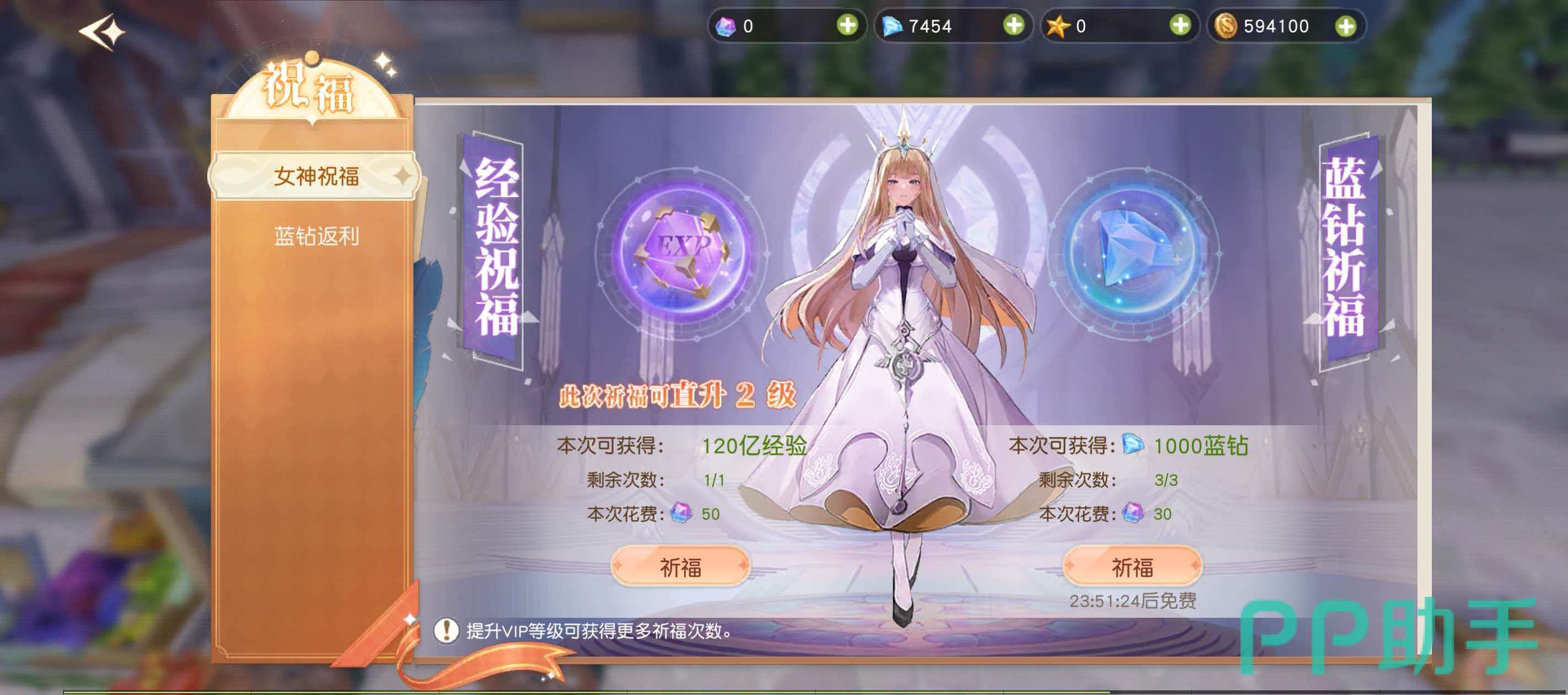 经核实,《星神纪元》官方版本中并无“天使祝福”相关功能模块。实际对应玩法为“女神祝福”,位于游戏主界面右上角活动区域,图标清晰可见。点击进入后,界面提供两种祈福模式:免费祈福与彩钻祈福。二者每日限各进行1次。其中,免费祈福固定返还1000蓝钻;彩钻祈福则具备等级跃迁效果——可使本次祈福经验直抵2级,总计获得120亿经验,消耗彩钻数量为50枚。