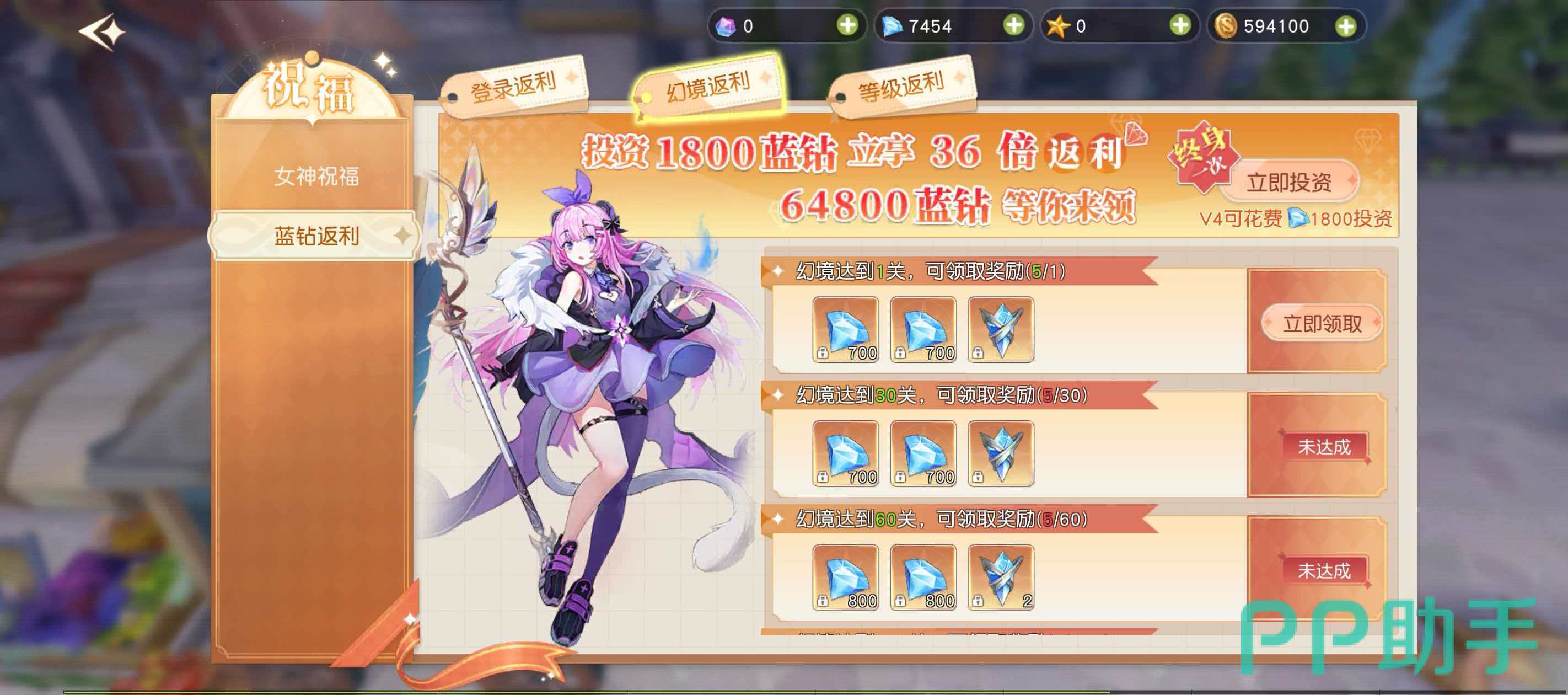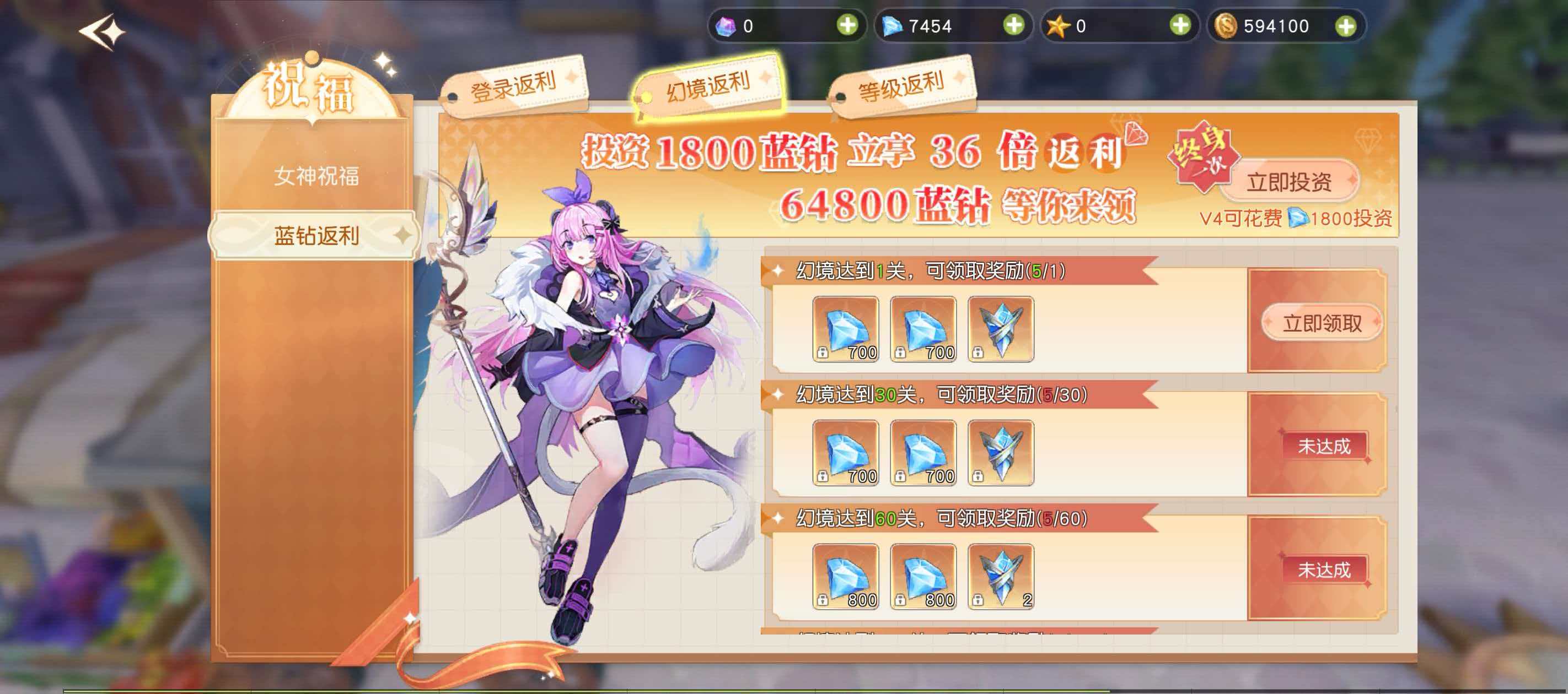 除基础祈福外,“女神祝福”系统还整合了蓝钻返利功能,需通过前置投资激活。该模块包含三项独立返利计划:登录返利、幻境返利与等级返利。登录返利门槛为600钻石,支持15倍返利,总可领取蓝钻9000枚,按累计登录天数分批发放;幻境返利要求玩家达到VIP4及以上等级方可参与,投资1800蓝钻可享36倍返利,总计64800蓝钻,需通过挑战幻境关卡逐步解锁;等级返利为一次性终极投资方案,投入3000钻石即可获得120倍返利,最终到账蓝钻达36000枚。