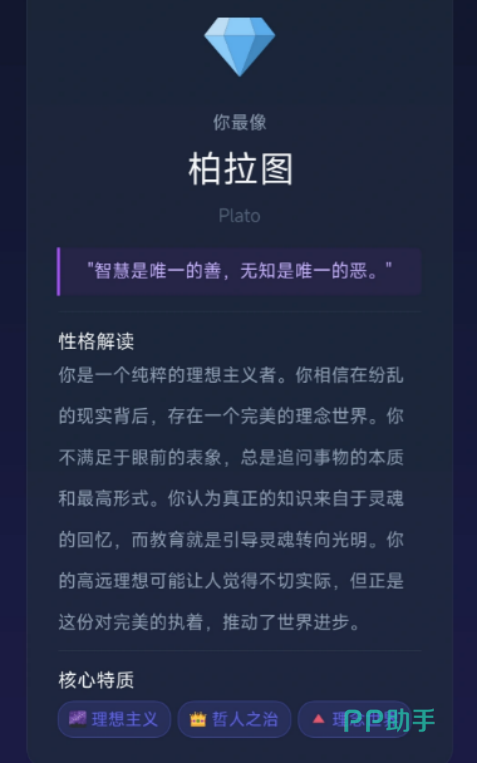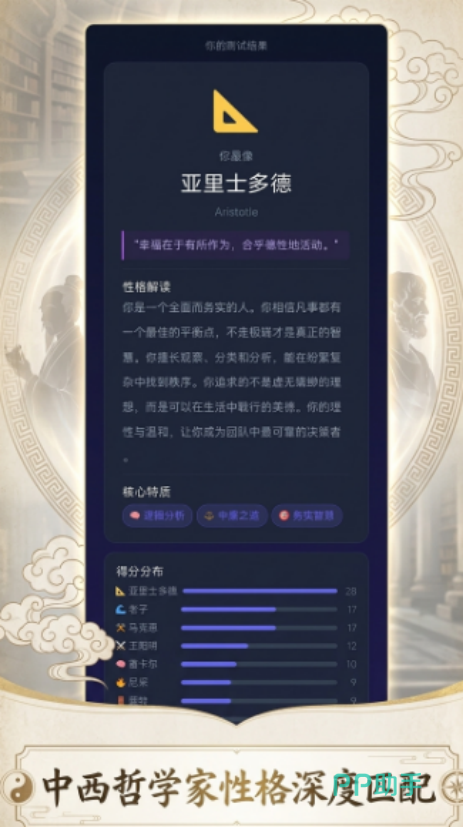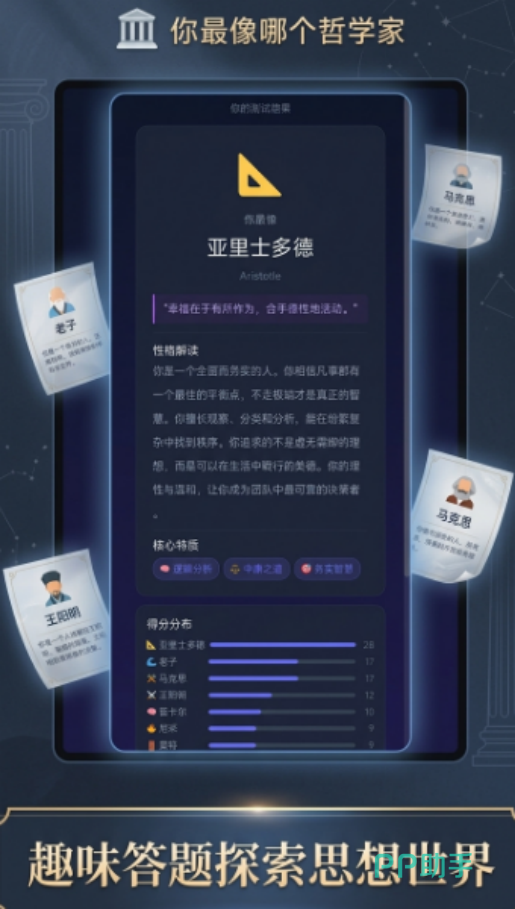 你最像哪个哲学家手游好玩吗?这款融合哲学思辨与心理测评的创新型休闲游戏,正吸引越来越多玩家的关注。游戏以深度人格分析为内核,通过精心设计的互动问答机制,为每位用户生成专属的哲学家匹配报告。玩法轻松易上手,无需复杂操作或战斗系统,却能潜移默化地引导玩家接触东西方哲学思想脉络——从先秦时期的孔子、庄子,到古希腊的苏格拉底、斯多葛学派代表人物,再到近现代存在主义哲人,均有覆盖。