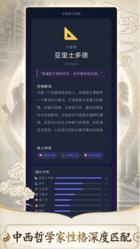 游戏主打“哲思+轻量化体验”的双重定位,共设置45道原创题目,涵盖价值观判断、认知倾向、伦理取向及生活态度等多个维度。答题结束后,系统依据逻辑模型自动比对历史中真实存在的哲学家思想体系,输出高匹配度结果。内容编排兼顾知识性与可读性,将晦涩的哲学概念转化为具象情境题,帮助普通用户在沉浸式互动中理解不同流派的核心主张,如儒家的仁政观、道家的自然主义、伊壁鸠鲁学派的快乐哲学等。