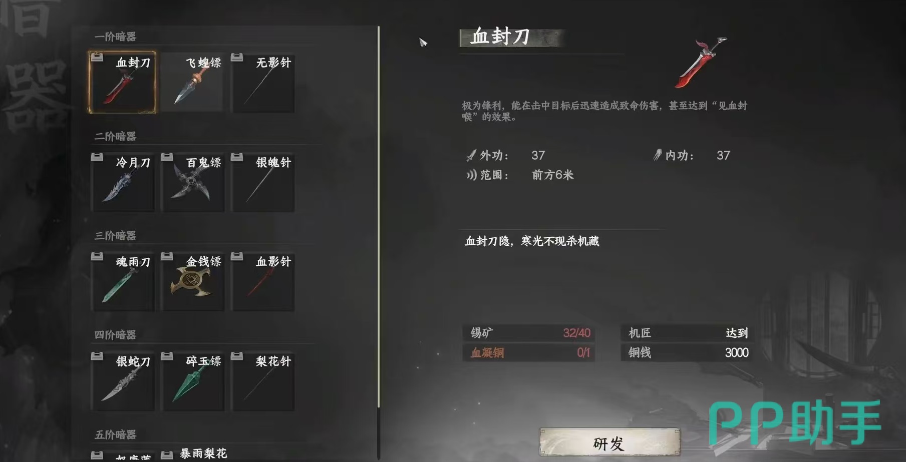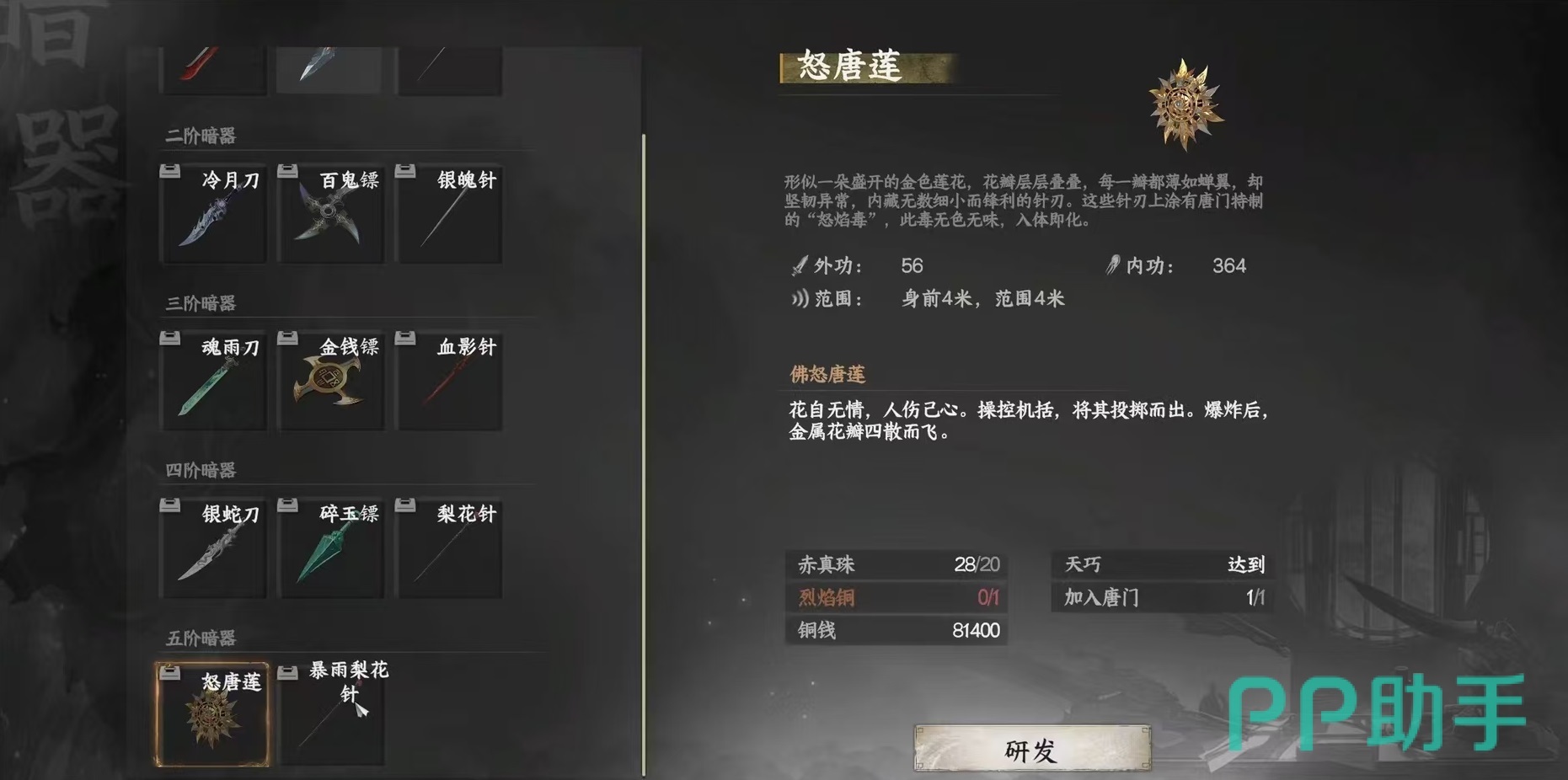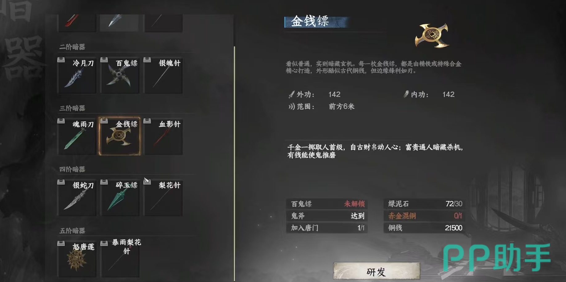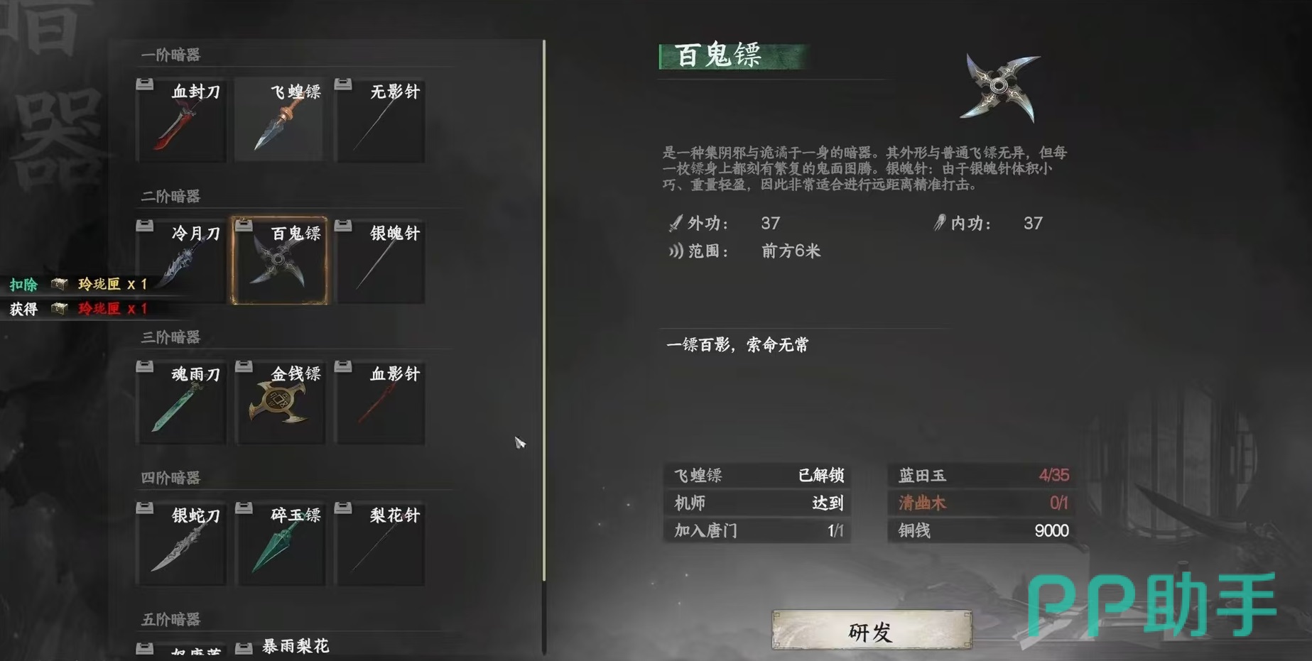 以下列举几种常见暗器及其所需材料,供玩家参考:血封刀需消耗锡矿40块、血凝铜1个及铜钱3000;百鬼镖则需要蓝田玉35个、清幽木1块、铜钱9000;金钱标制作需绿泥石30块、赤金混铜1块、铜钱21,500;碎玉镖要求翡翠25块、冰裂纹玉1块、铜钱42375;怒唐莲则需赤真珠20个、烈焰铜1块、铜钱81400。所有未解锁的暗器配方均可提前预览,便于玩家规划资源收集路线。