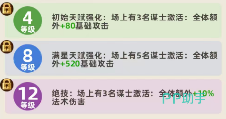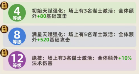 等级成长进一步强化了这一机制:4级时,3谋士触发的攻击力加成为80点;升至8级满星后,5谋士条件下的全队增益提升至520点。值得注意的是,貂蝉的等级上限为12级,这意味着在高阶对局中,她可长期维持顶级增伤覆盖率。因此,在谋士阵容构建中,优先将貂蝉升至高星级并快速拉满等级,是提升团队整体DPS的关键前置动作。