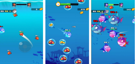 以大鱼吃小鱼的玩法为核心,在深不可测的海洋当中,将会呈现出形形色色的鱼儿,每种鱼类的生存方式都完全不同。开局后您只是一条体型较小的鱼类而已,在到处充满危机的海洋当中,必须要通过逐渐吞噬的方式,才能让自己变得越来越大。吃掉的鱼类越多,获得的分数就会越高,还可以利用相应的金币,在水族馆当中兑换各种鱼类以及漂亮的饰品。