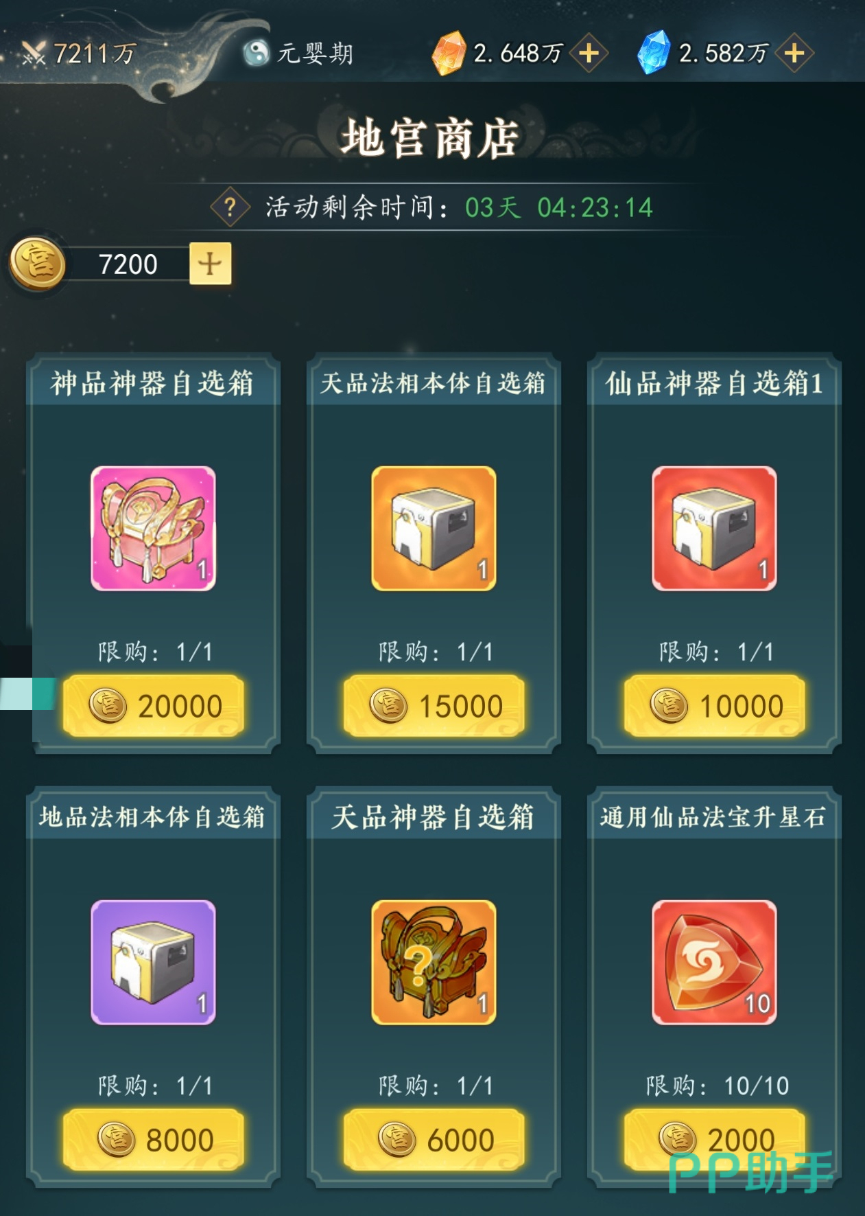 关卡中随机触发的事件需分类应对:机关与符咒不消耗体力,务必全部拾取;丹药类事件同样无体力消耗,且提供永久属性加成,属于必选项;普通怪物可分批次挑战,单次击败即获大量地宫币,灵活适配碎片化时间;锦囊类奖励性价比偏低,仅当体力富余时酌情处理。所获地宫币应优先兑换天品法相本体自选箱与天品神器自选箱,其次再考虑其他功能性道具。