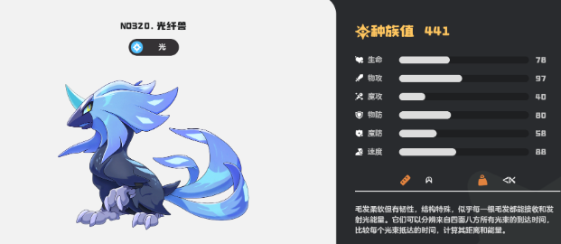 之后就是光纤兽这个精灵,他的攻击和速度都是非常突出的,可以当做队伍的核心宠物来使用,整体的强度也是非常高的,大家可以通过野外捕捉来获得,可以从犀角鸟不断的进化,大家想要获得还可以借助月卡的奖励或者参与限时的活动来获得相关的碎片,只有将碎片集齐之后,才可以来进行兑换,它的光属性是可以来克制暗属性的,对于大家来说,对抗暗属性的精灵是非常有用的,同时还可以提升整个队伍的加成,来体现互补的阵容,这个宠物还具备坐骑的功能,大家可以通过进化来获得。