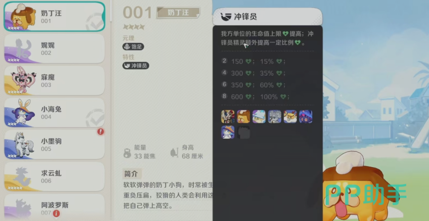 作为拥有冲锋员特性的单位,奶丁汪还能为全队提供生命上限加成。若队伍中存在多个同类型冲锋员精灵,则可进一步触发羁绊效果。当冲锋员总数达到8人时,团队总血量可额外提升600点,并获得100%生命值征服能力;即使未凑齐8人,仅需4人即可激活部分效果,而6人则可达到中等强度的加成水平,其余阵容位置可灵活搭配其他功能性精灵以完善战术配置。